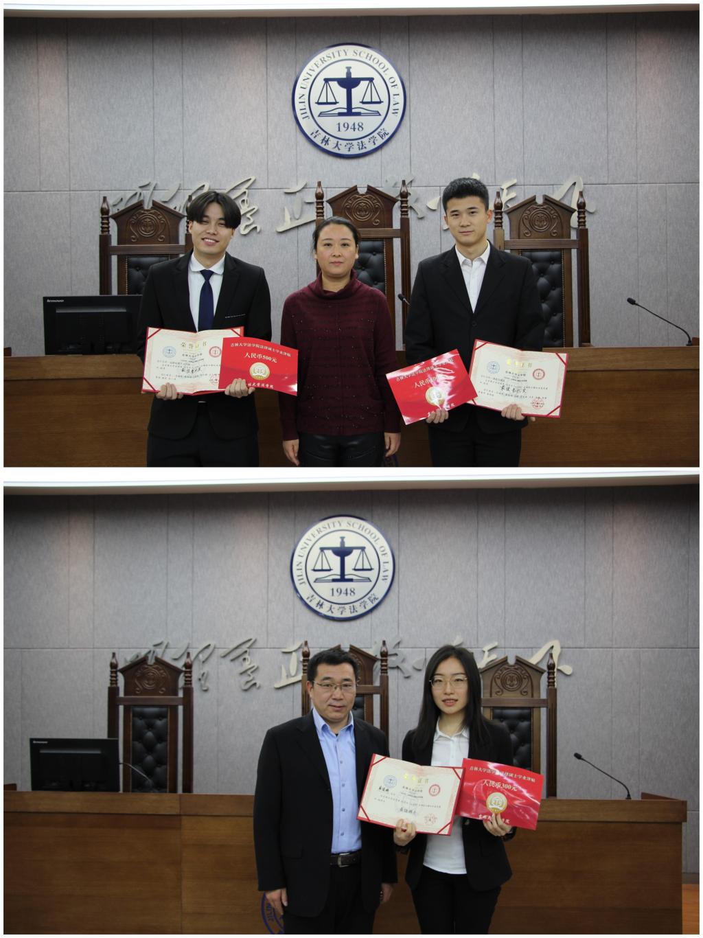 法公司党委副书记徐杰老师向现场嘉宾与同学们宣布了本场竞赛的获奖队伍和队员后进入颁奖典礼。王立国老师为获得本届模拟法庭竞赛优秀队员奖的李璐、单佳琦、徐晖、刘莹、高艺琪、邵学颖、刘泽宇、许超、王乙渊和陈一鸣等10位同学颁奖;高宇老师为获得最佳风采奖的李璐同学和刘泽宇同学颁奖。