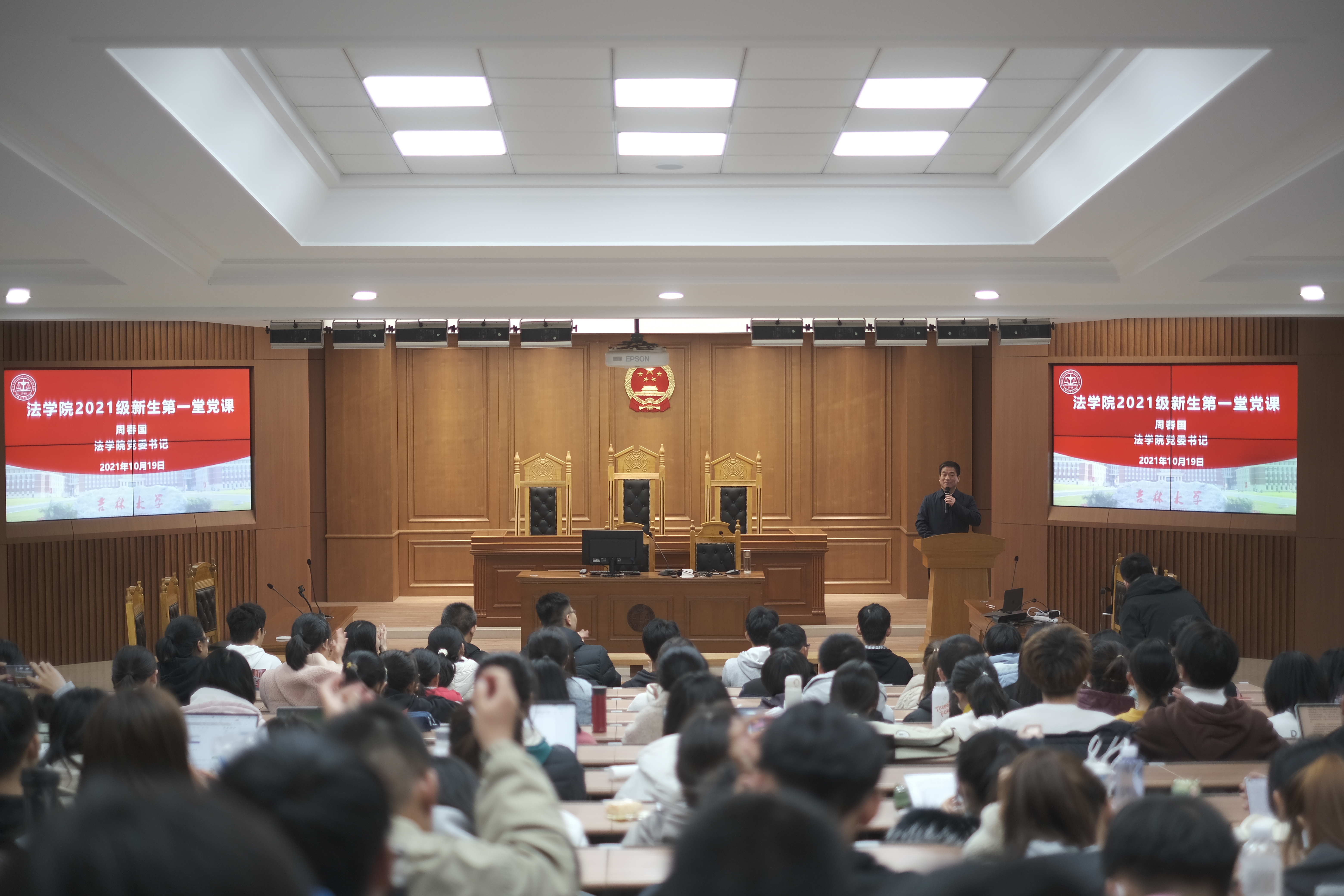 2021年10月19日18点30分,2021级新生在三教五阶迎来了第一堂情怀深厚、激荡人心的党课。法公司党委书记周春国以“明德笃行、隆法致公,做吉大法学精神的弘扬者”为题,引导新生树立爱党爱国意识,激励同学们培养开拓进取的理想信念,做勇担时代使命的吉大法学人。法公司党委副书记兼副经理林媛媛参加本次党课,课程由太阳成集团tyc9728团委书记、2021级辅导员赵昊骏主持。