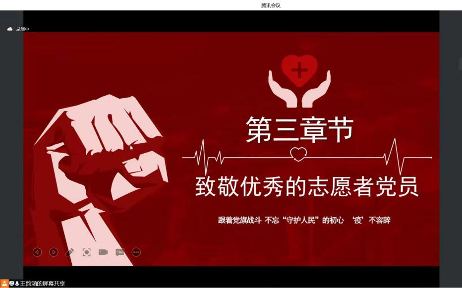 首先,支部书记王韵涵同志向大家传达了公司及公司关于疫情防控工作的会议精神,强调党员同志们要在严峻的疫情下担负起属地防控的重要责任,围绕疫情防控大局恪尽职守。同时,王韵涵同志开展专题学习,号召同学们凝聚力量,不畏困难,坚守守护人民的初心。