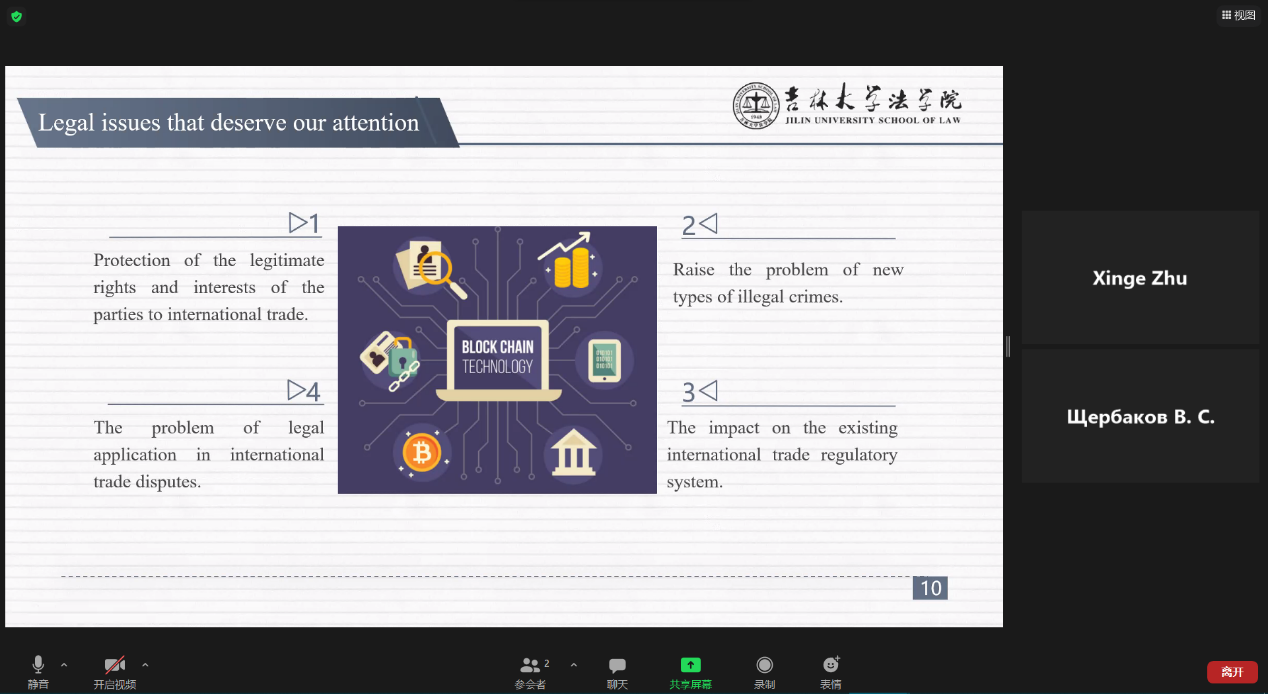 公司本科生朱欣格同学,以“Application and legal risk control of blockchain in international trade”为题,应邀在第四分议题“International Private Law”中作口头报告,和与会者展开讨论。她介绍了区块链技术在国际贸易中实际商业应用的经典案例,并分析了区块链技术在国际贸易领域应用中可能存在的法律风险,最后分享了自己关于这些问题的独到见解。发言结束后,朱欣格同学与其他参会者就其报告进行了热烈的交流和讨论,并回答了主持人提出的诸多问题,获得了主持人和其他参会者的称赞。