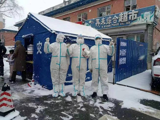 三月伊始,疫情突增,王军明第一时间向其所在的朝阳区永昌街道惠民社区报到,成为投身抗疫第一线的社区志愿者。“作为一名党员,我觉得有义务为疫情防控做些什么。在穿上防护服、戴上医用隔离面罩的那一刻,使命感从心里油然而生。”他所在的志愿者队伍肩负着382户居民以及60余户商户的日常防疫工作,包括发放疫情防控出入证、新冠肺炎鼻拭子检测盒,订购和发放蔬菜包以及维护核酸检测秩序等。惠民社区没有安装电梯,王军明们的足迹遍布每一座楼宇,他们所传递的不仅是防疫物资,更是爱与暖、光与热。而岁月静好的背后则是志愿者们所遮挡的风刀霜剑。3月15日的长春大雪纷飞,寒风凛冽,但王军明和志愿者们仍旧照常工作。为了节省非常紧张的防护物资,他们不吃不喝,不去洗手间,哪怕汗水和雪水早已湿透了防护服。隔离用的彩钢板材被风雪吹倒,他们就用身体顶住,等待修理……回到家,脱下防护服的王军明像是蒸了桑拿,女儿看了说:“我将来也要做大白!”
