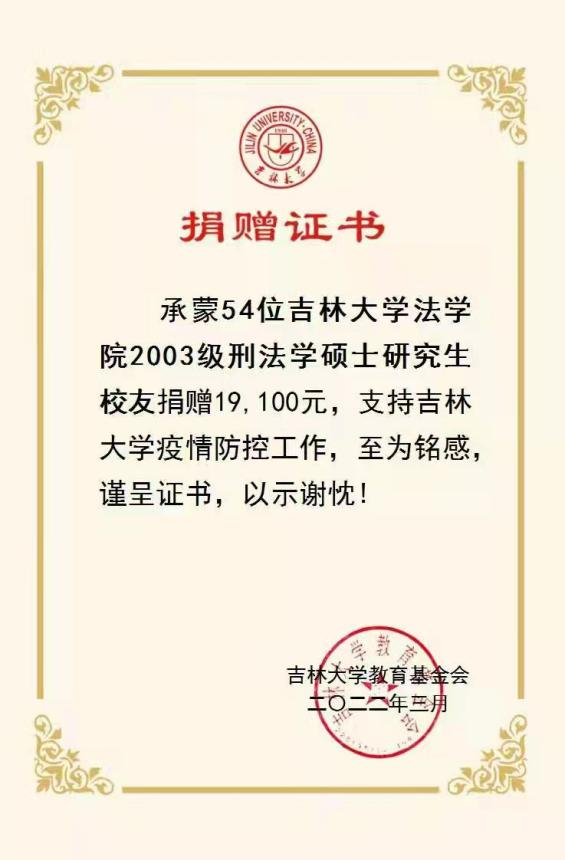 “2003级刑法学硕士研究生一共54名同学,无论在校就读还是毕业之后一直都是一个团结的、充满正能量的集体,3月份以来一直心系母校,经过集体倡议和捐款行动,共募集人民币19100元,捐赠给母校,以此来表达同学们对母校抗疫工作的支持。”这段话摘自“吉大法学2003级刑法学硕士研究生全体员工的来信”,这是一封吉大人写给吉大的情书。而王军明正是这次捐款的组织者之一。