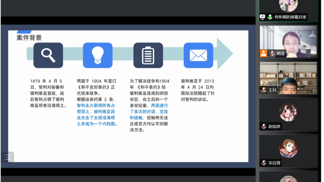接下来,2021级法律硕士佟昕桐同学的汇报聚焦两个热点案例,案例一是“玻利维亚诉智利进入太平洋谈判义务案”,其中“何种行为可能创设国际法上的义务”、“谈判义务的内容、要求”等问题引发大家广泛思考;案例二是“查戈斯群岛咨询意见案”,由此引发的“国家同意原则”问题与“咨询管辖权范围及效力”问题引起同学们广泛讨论。