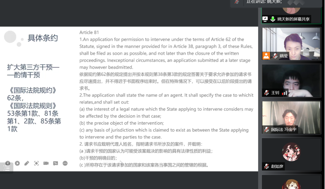 接下来,国家发展与安全研究院2021级法学硕士研究生姚天新同学汇报自己的读书成果。她汇报的主题是在立足第三方干预的角度上论证如何通过修改国际法规则完善国际实体法利益,并结合具体《国际法规则》法条说明了关于第三方干预的相关问题,对于当事国如何作为第三方参与干预表达了自己的困惑。
