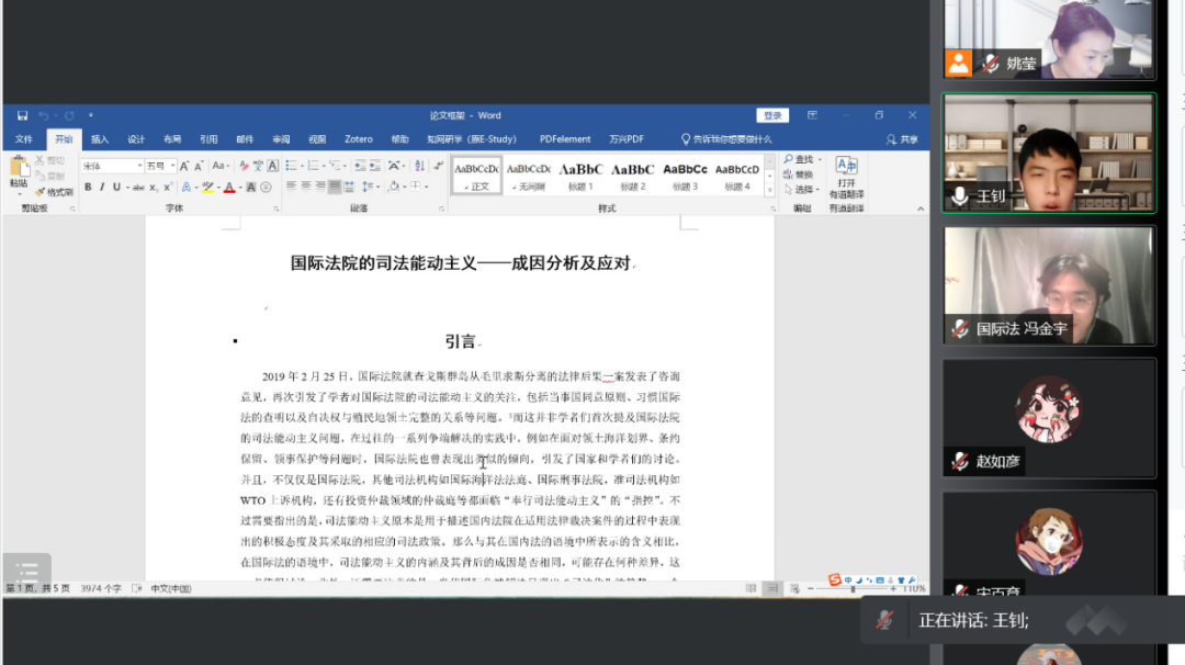研一的同学汇报完读书成果之后,研二的同学开始汇报自己的论文进展状况。20级法学硕士王钊同学首先进行汇报,他的论文主要针对国际法院的司法能动主义。他将自己的论文思路一一进行阐述,并指出司法能动主义的概念、国际法院的相关实践等问题还需进一步深入研究。
