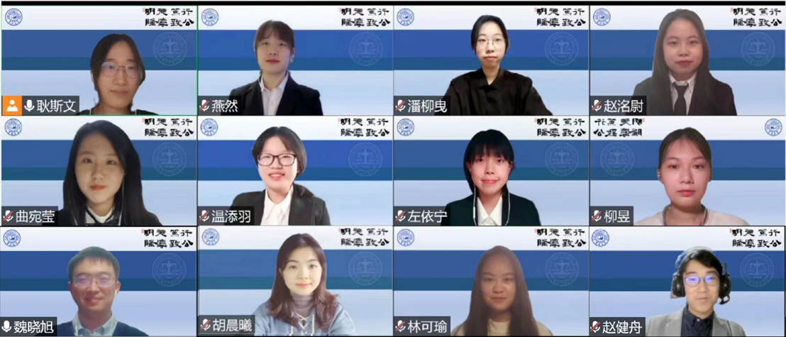 公司高度重视本届赛事,于202110月初开展队伍组建工作,由国际法学博士研究生魏晓旭担任教练,由国际法学硕士研究生耿斯文担任领队,以本科生燕然、赵洺尉、左依宁为上场队员,以本科生曲宛莹、温添羽为研究员,以本科生柳昱、潘柳曳、胡晨曦、林可瑜为队员,并由国际法学博士研究生赵健舟、法理学博士研究生陆玥提供赛事支持。