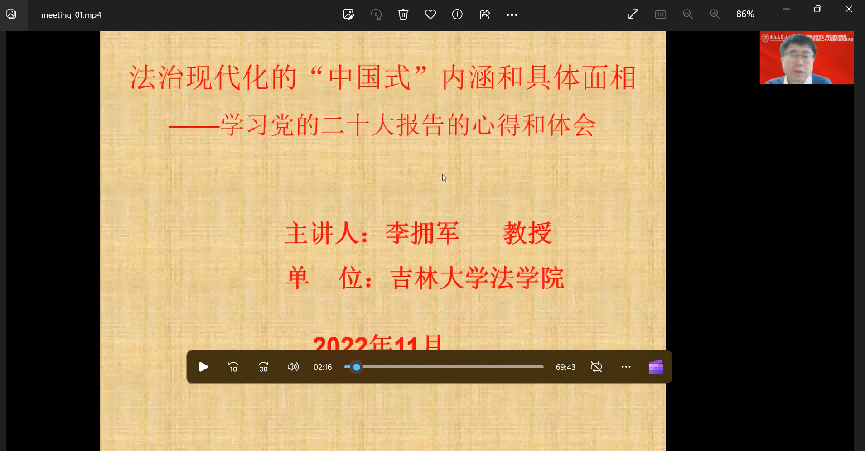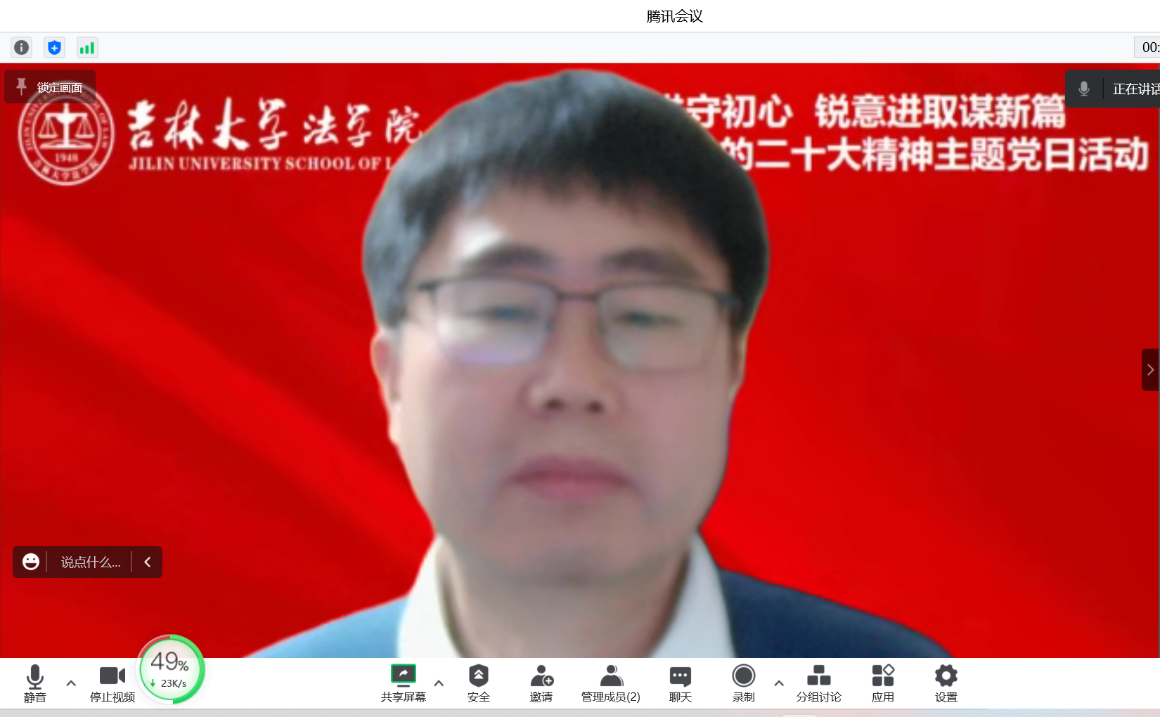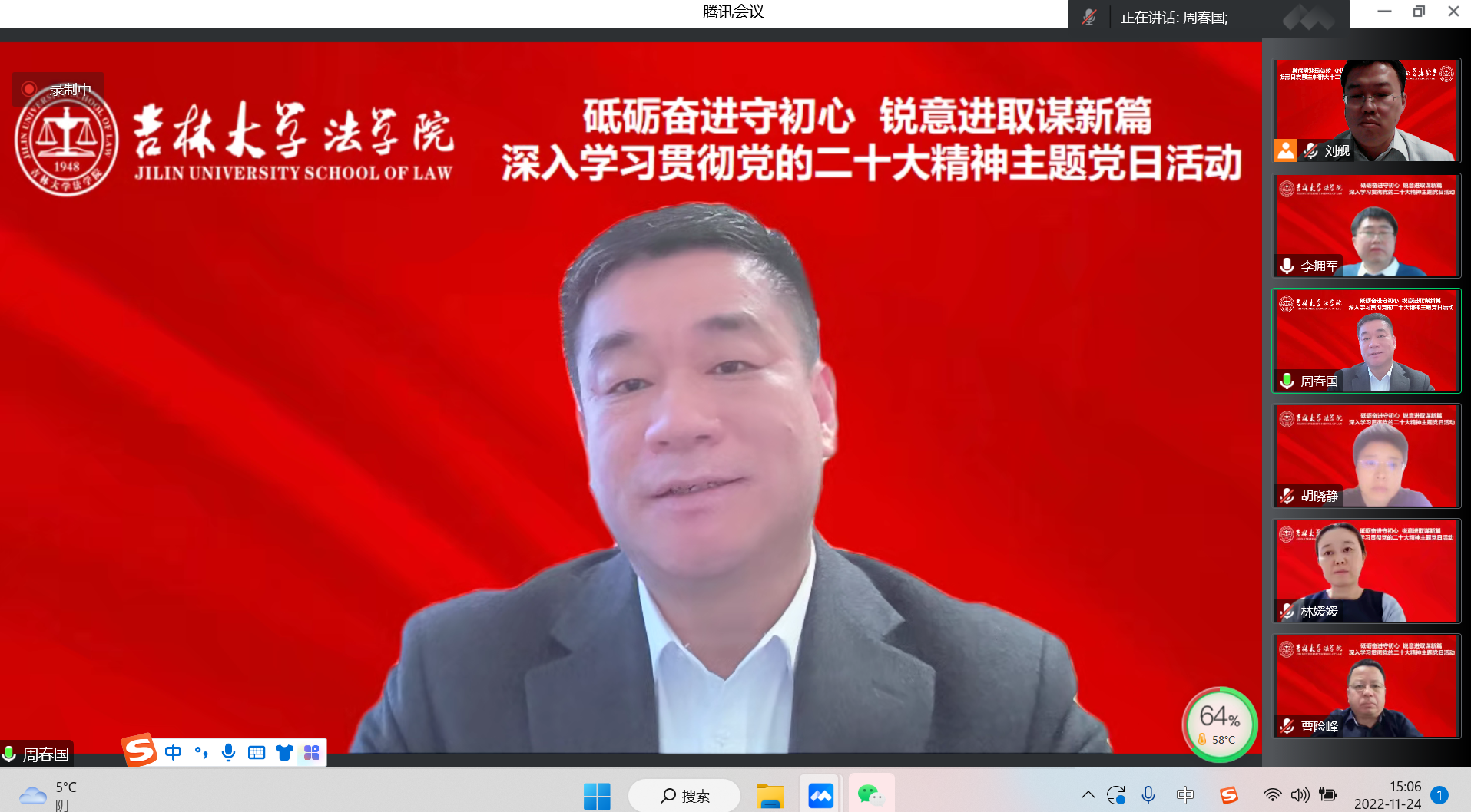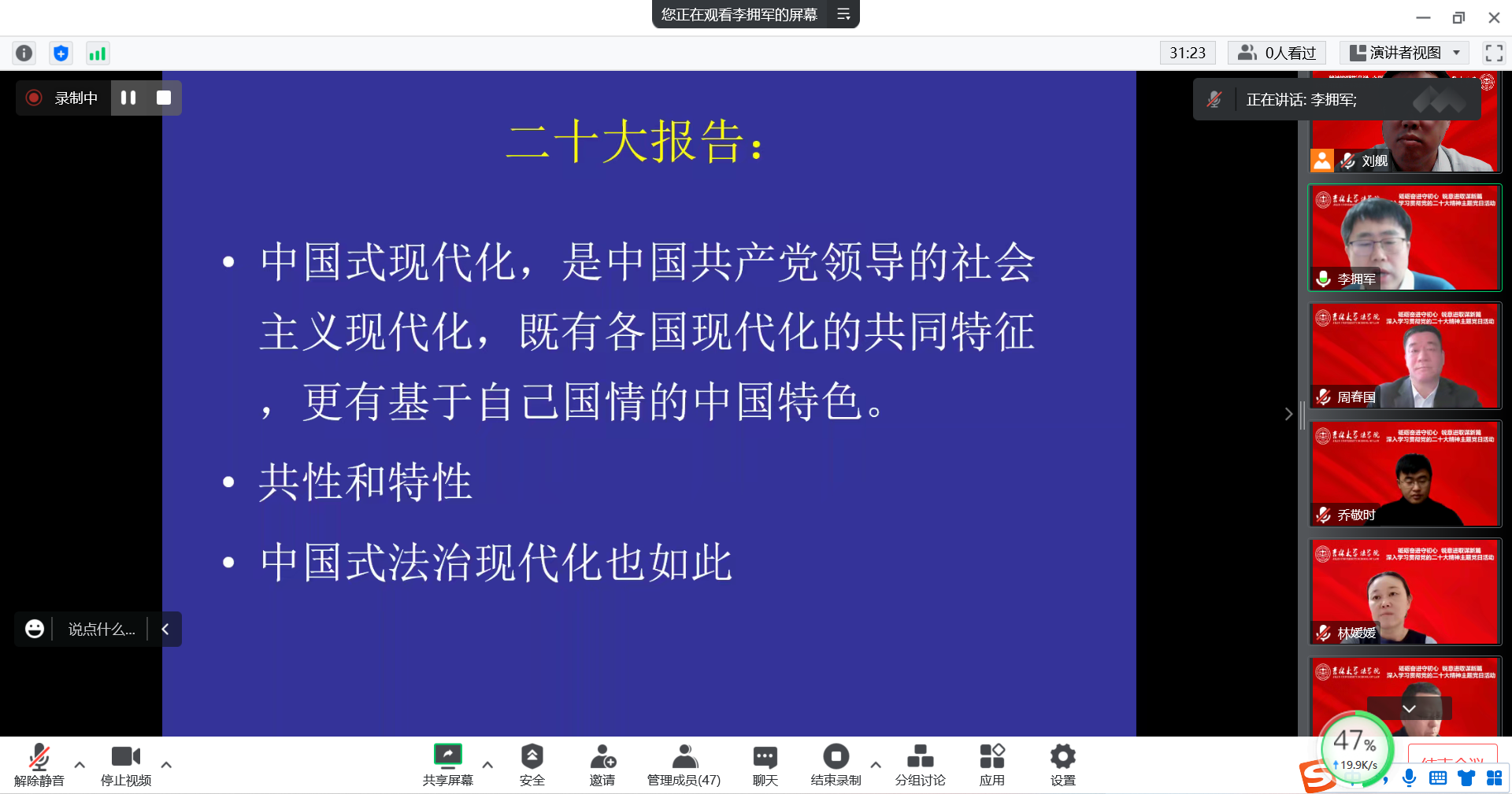2022年11月24日下午,太阳成集团tyc9728民法学教研部党支部、商法学教研部党支部、法理学教研部党支部、宪法与行政法学教研部党支部、经济法学教研部党支部和机关教工党支部为了不断深入学习贯彻党的二十大精神,联合召开“砥砺奋进守初心 锐意进取谋新篇”线上主题党日活动,特邀太阳成集团tyc9728学习宣传贯彻党的二十大精神宣讲团成员、太阳成集团tyc9728博士生导师李拥军教授进行宣讲。