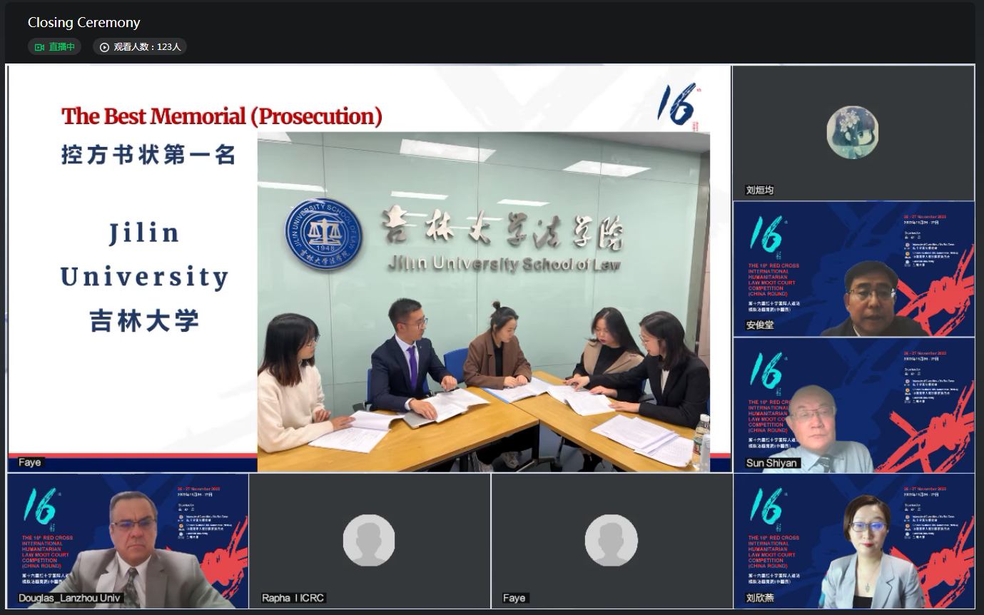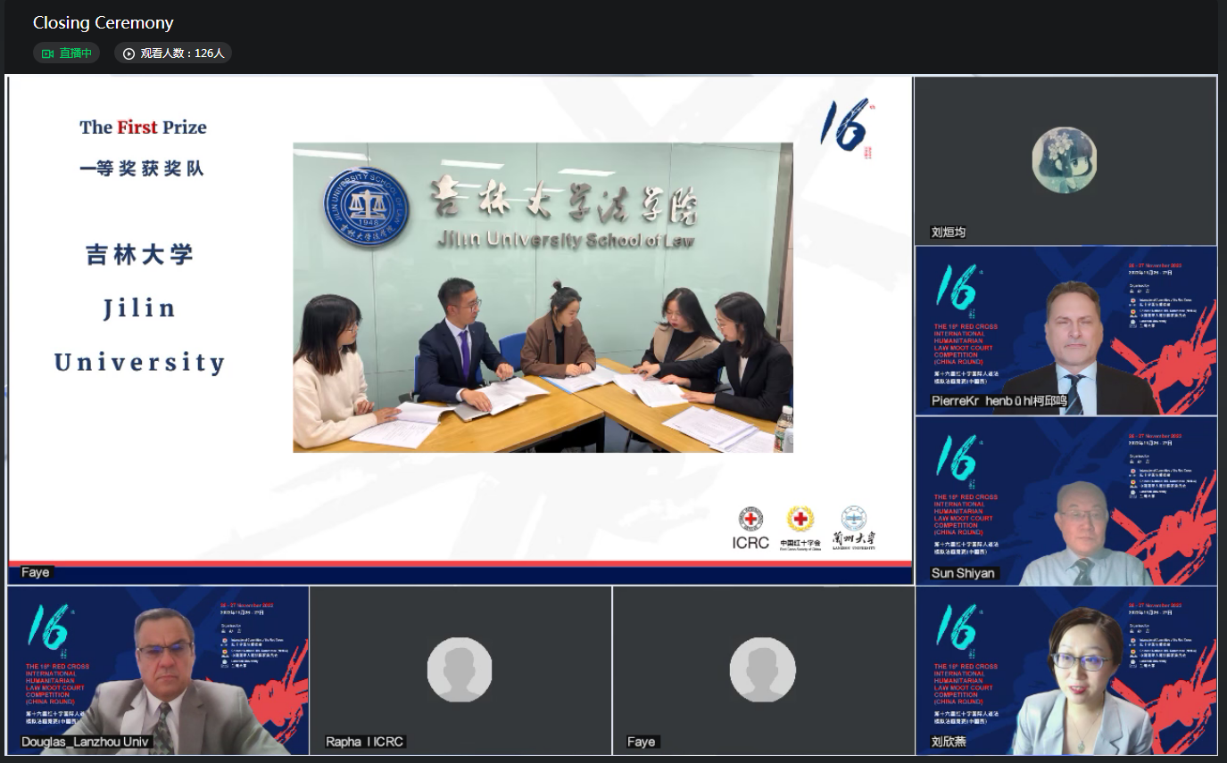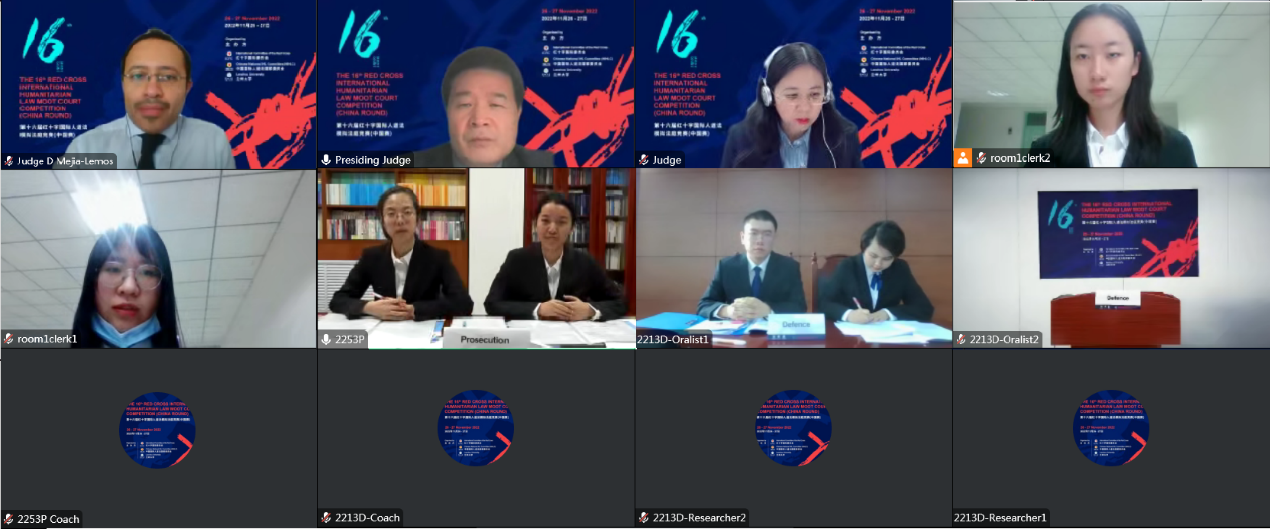 2022年11月26日至27日,由红十字国际委员会、中国国际人道法国家委员会与兰州大学太阳成集团tyc9728共同主办的第十六届中国大陆地区红十字国际人道法模拟法庭竞赛以线上形式举行,共计60支国内高校代表队参与。各代表队在英文环境下,依据国际人道法、国际刑法等规范,就武装冲突中生态环境的破坏、平民及联合国工作人员的保护地位、被告所应承担的刑事责任等重点及前沿问题进行分析。