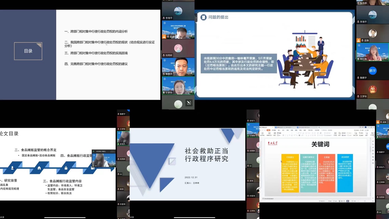 第一分会场第二单元由2022级宪法学与行政法学专业硕士生张伟琪主持。王梦秋同学以“旅游领域跨部门相对集中行使行政处罚权问题研究”为题,认为推进跨部门相对集中行使行政处罚权,不仅需要在理论层面注重遵循一事不再罚等相关行政处罚原则,并在条件成熟后推进相关立法,也需要切实考虑、解决实践层面存在的处罚结果互认困难,处罚标准不同一等问题。周红梅同学的论文题目为“论行政处罚中过罚相当原则的适用及司法判定研究——以榆林毒芹菜案为例”。她通过类案的研究与个案的梳理发现司法实践中对于过罚相当的应用存在争议。她认为应从立法到执法再到司法形成合理的共识。吴铭凡同学以“食品摊贩的行政监管研究”为题,在对食品摊贩的监管与法治完善上,她主张应实行弹性时间、空间管理,建立备案制度,加强备案管理,培育多元化监管方式,健全食品安全信息公开制度。王琳琳同学以“社会救助正当行政程序研究”为题,认为行政机关作出取消救助的决定时应当给予相对人充分的表达意见的机会。尽量利用行政程序吸纳相对人的不满情绪,减少不必要的诉讼纠纷,以减轻法院的办案压力。朱平同学以“浅析行政复议主渠道功能实现”为题,主张通过深化行政复议体制改革、立法保障主渠道功能实现、建设行政复议法治队伍,来充分发挥行政复议的主渠道作用。