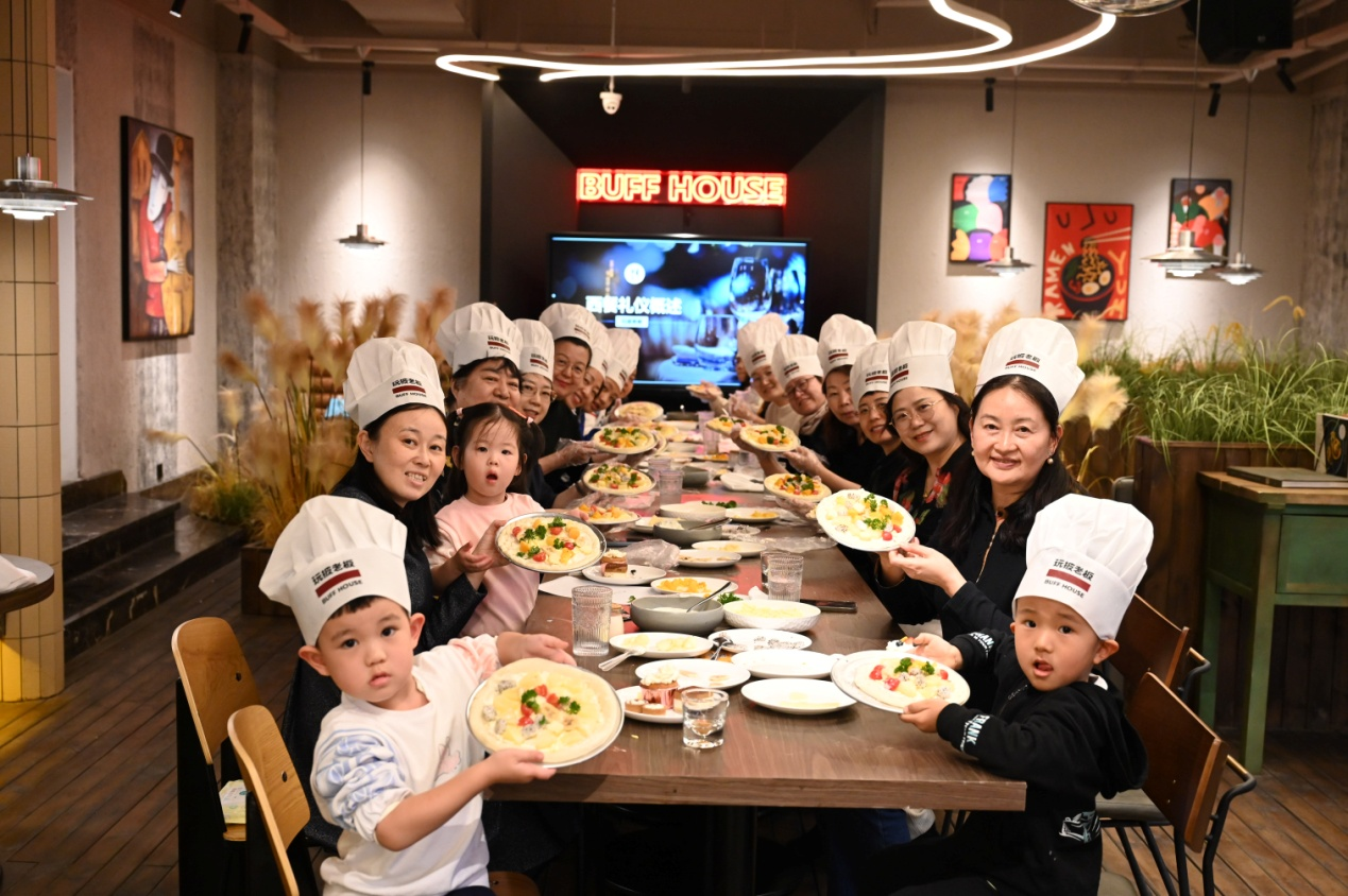 活动现场设置在家源学苑楼下的“玩披老板”披萨店内。为了欢迎老师们的到来,店内进行了精心布置,长条桌上也已经准备好了制作披萨的馅料和酱料。首先,由专门的老师为大家讲解披萨烘焙小知识,让大家对披萨的起源、种类有了了解,期间穿插了问答环节,大朋友和小朋友们都踊跃回答问题,现场氛围活跃,互动交流热烈。准备就绪之后,老师们按步骤动手制作,在面饼上添加配料,摆出自己喜欢的图案,一个个独一无二的披萨生胚呈现在眼前,大家纷纷和自己的作品拍照留念,节日气氛浓郁欢声笑语不断。在等待披萨出炉的茶歇间隙,老师们又兴致盎然地学习了西餐礼仪,谈天说地,分享生活中的小美好,感受相聚喜悦。二十多分钟后,披萨新鲜出炉,暖香扑鼻,大家按照之前分配的号码找到了自己制作的披萨,体验手做的欣喜,一起品尝满满的幸福味道。