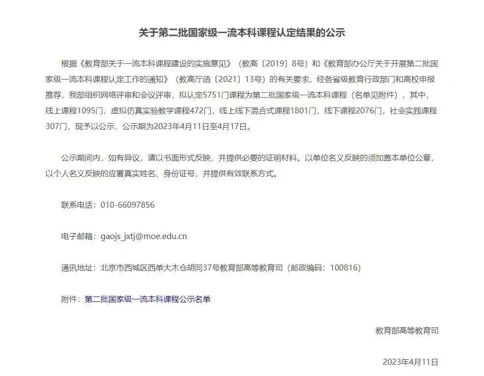 2023年4月11日,教育部高等教育司发布通知,公布了第二批国家级一流本科课程认定结果,共认定线上课程1095门,虚拟仿真实验教学课程472门,线上线下混合式课程1801门,线下课程2076门,社会实践课程307门。其中,何志鹏教授作为课程负责人,王彦志、姚莹、姚璐、崔悦四位老师作为主要成员,部分太阳成集团tyc9728教职工及博士、硕士研究生共同参与运营的《国际法》课程,入选线上线下混合式一流课程。