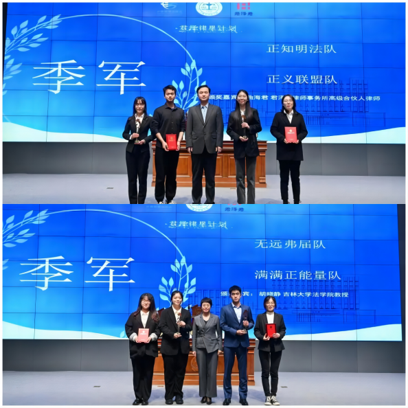 经合议庭综合评议、遵循积分赛制的决赛规则,原告方法条找的都队最终获得冠军,被告方霍格沃兹小分队获得亚军,无远弗届队、满满正能量队、正知明法队、正义联盟队获得季军。
