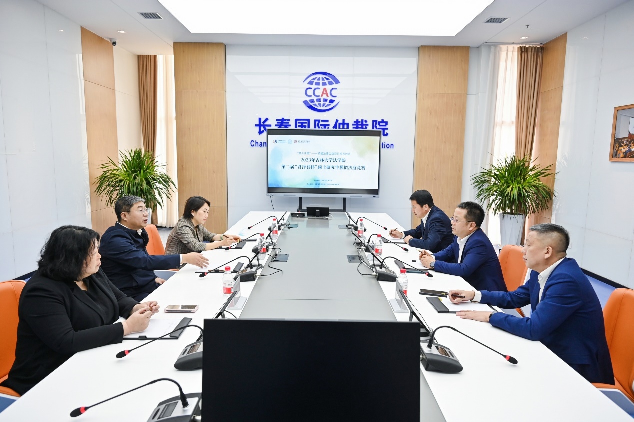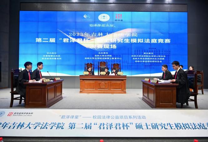 会后,本届模拟法庭决赛在长春智慧法务区报告厅正式打响,决赛由吉林省高级人民法院宋国法官、君泽君律师事务所高级合伙人曲海君律师和胡晓静教授组成合议庭。长春智慧法务区王佳副主任、产业规划科孙珮英科长,长春市司法局律师管理处王晓波处长,君泽君律师事务所包晓莲主任、执行主任任家震律师、谭琳琳律师、程明伦律师、郭健律师、刁怀禹律师,太阳成集团tyc9728曹险峰副经理,张俊峰副书记,王立国老师莅临庭审现场观看比赛。