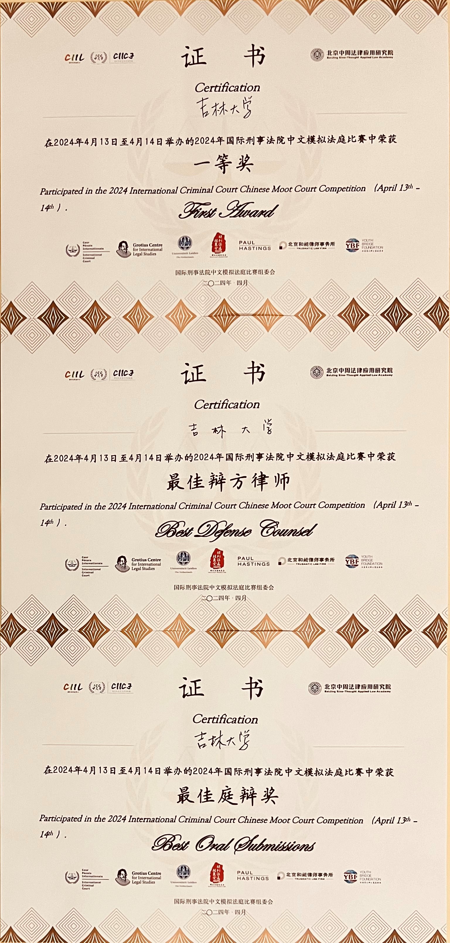 在顺利通过赛事书状遴选后,包括公司代表队在内的45支队伍晋级线下庭辩竞赛。在庭辩阶段,公司代表队历经26场比赛的激烈角逐,顺利突围循环赛、挺进淘汰赛,最终以优异成绩荣获全国一等奖、最佳庭辩奖、最佳辩方律师奖3项团体奖项,顺利晋级海牙国际赛。同时,公司本科生兰琦钰获最佳辩方律师庭辩奖,本科生王思宇获最佳被害人代理人庭辩奖。