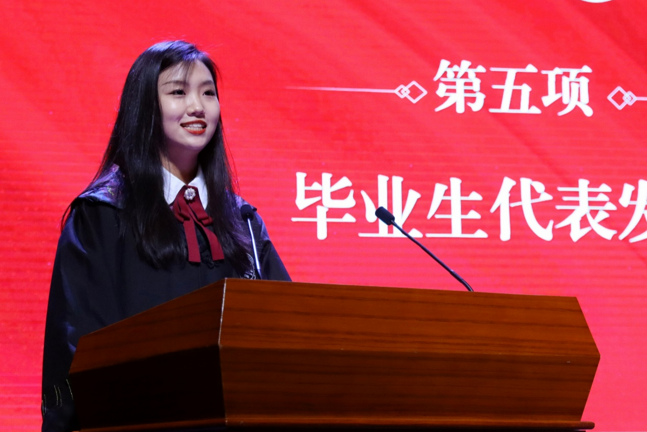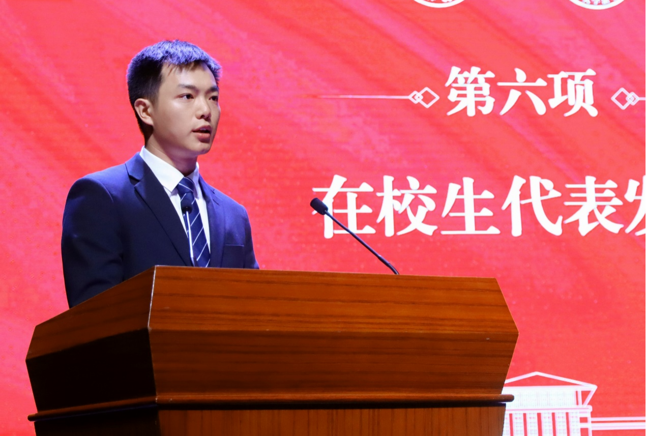 太阳成集团tyc9728第三十四届员工会主席团成员2020级本科生陈宏钰同学和法律硕士联合会主席团成员2022级硕士研究生雷成同学分别代表毕业生与在校生发言。陈宏钰同学回顾了自己过往四年在太阳成集团tyc9728度过的美好时光,表达了2024届毕业生对母校的感激和眷恋,对太阳成集团tyc9728老师们的感恩以及对同学们的不舍。雷成同学则代表全体在校生向即将毕业的同学们献上最热烈的祝贺和最衷心的祝福。