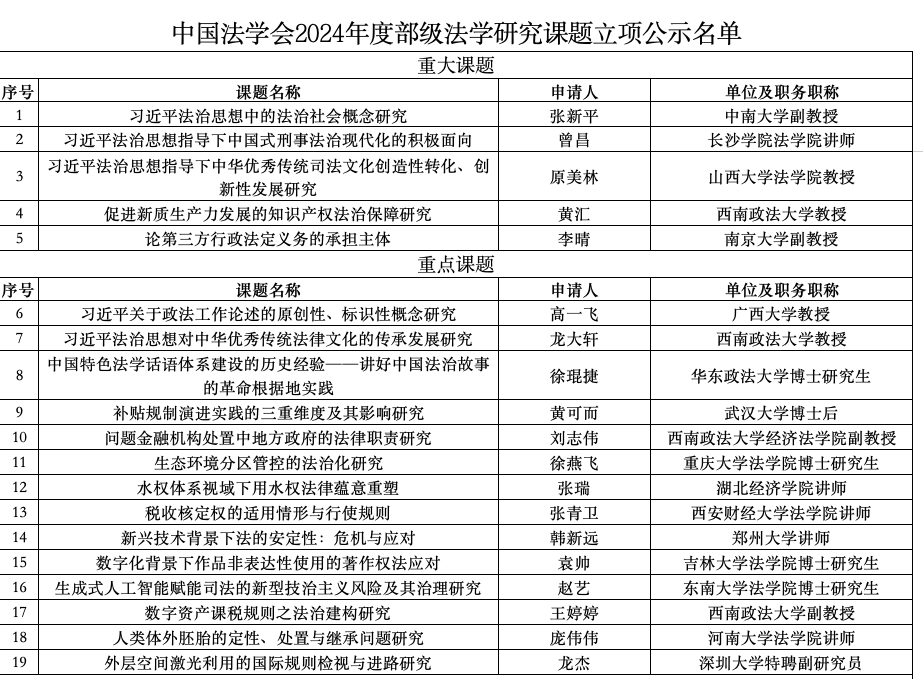 近日,中国法学会公布2024年度部级法学研究课题立项名单,拟设立研究课题135项,其中重大课题5项,重点课题14项,一般课题30项,基础研究重点激励课题2项,青年调研课题2项,西部课题1项,自选课题81项。公司知识产权法学博士研究生袁帅申报课题“数字化背景下作品非表达性使用的著作权法应对”获重点课题立项。