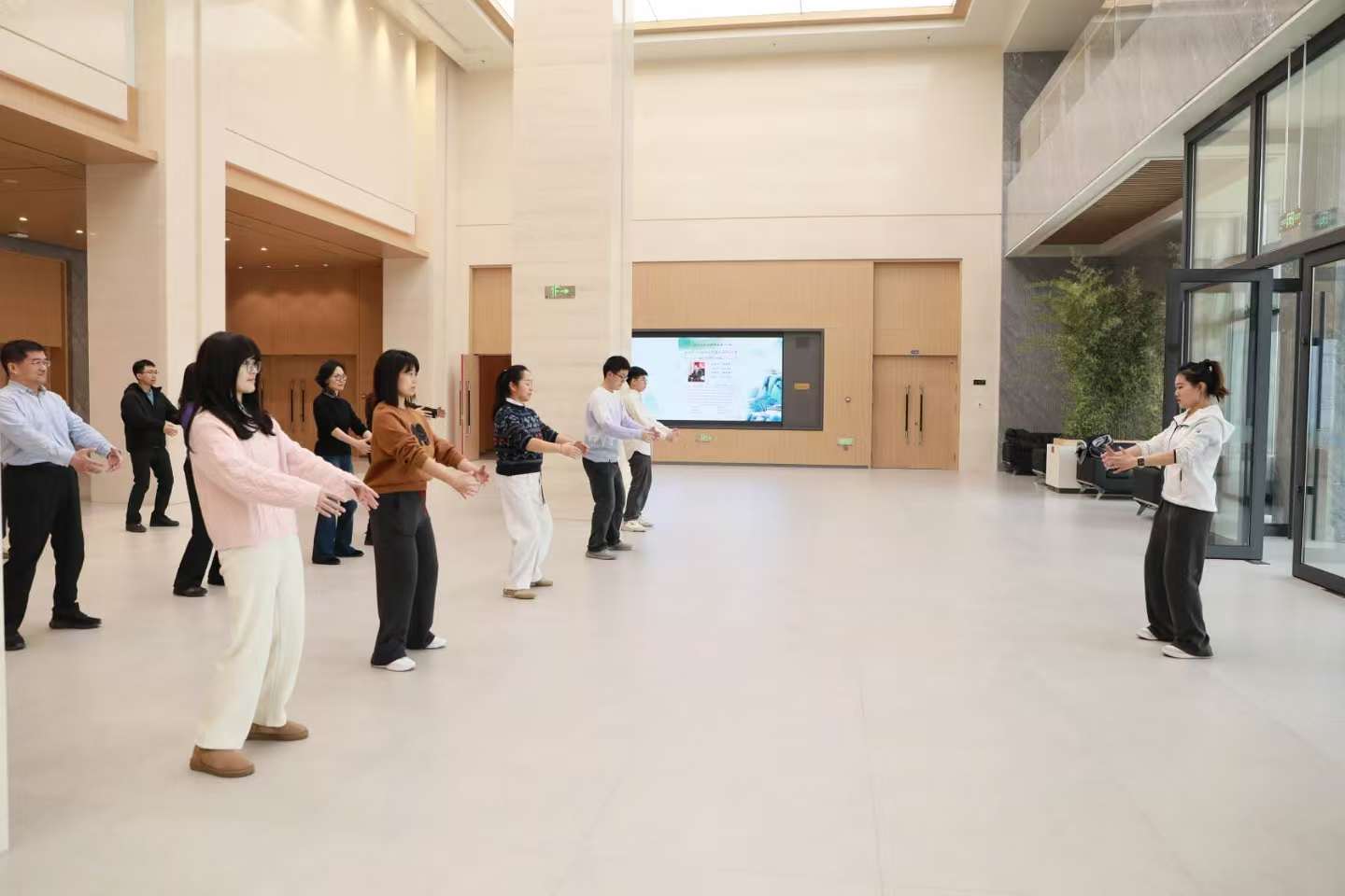 每周二中午,工会在院工会活动室播放八段锦教学视频,组织教职工跟练。每周四中午,特邀体育公司老师担任教练进行现场教学。教练以标准示范配合耐心讲解,分解“两手托天理三焦”“左右开弓似射雕”等招式动作,一对一纠正教职工动作细节,确保健身效果最大化。