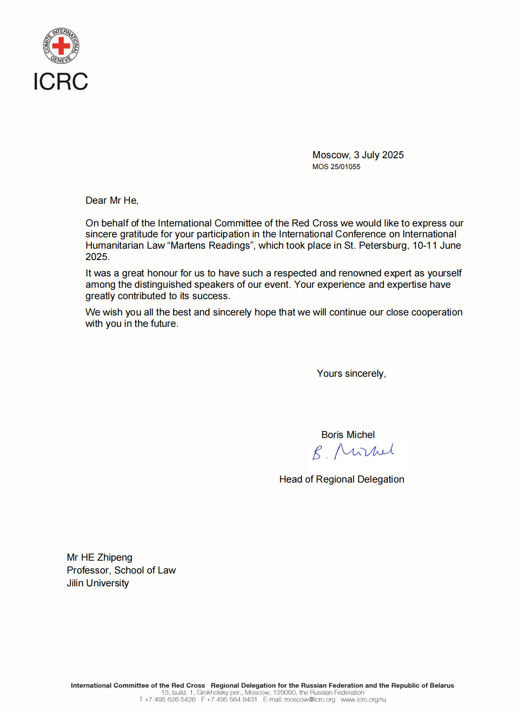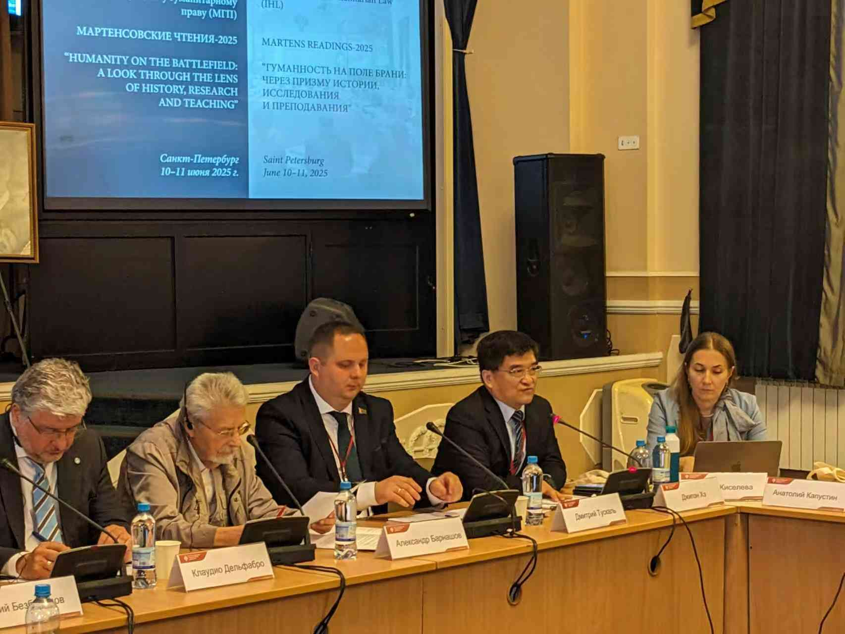 2025年6月,由红十字国际委员会俄罗斯联邦和白俄罗斯共和国地区(莫斯科)代表处主办的“马尔顿斯国际法研讨会”于俄罗斯圣彼得堡国立大学举办,何志鹏教授应邀参加并做会议发言。
