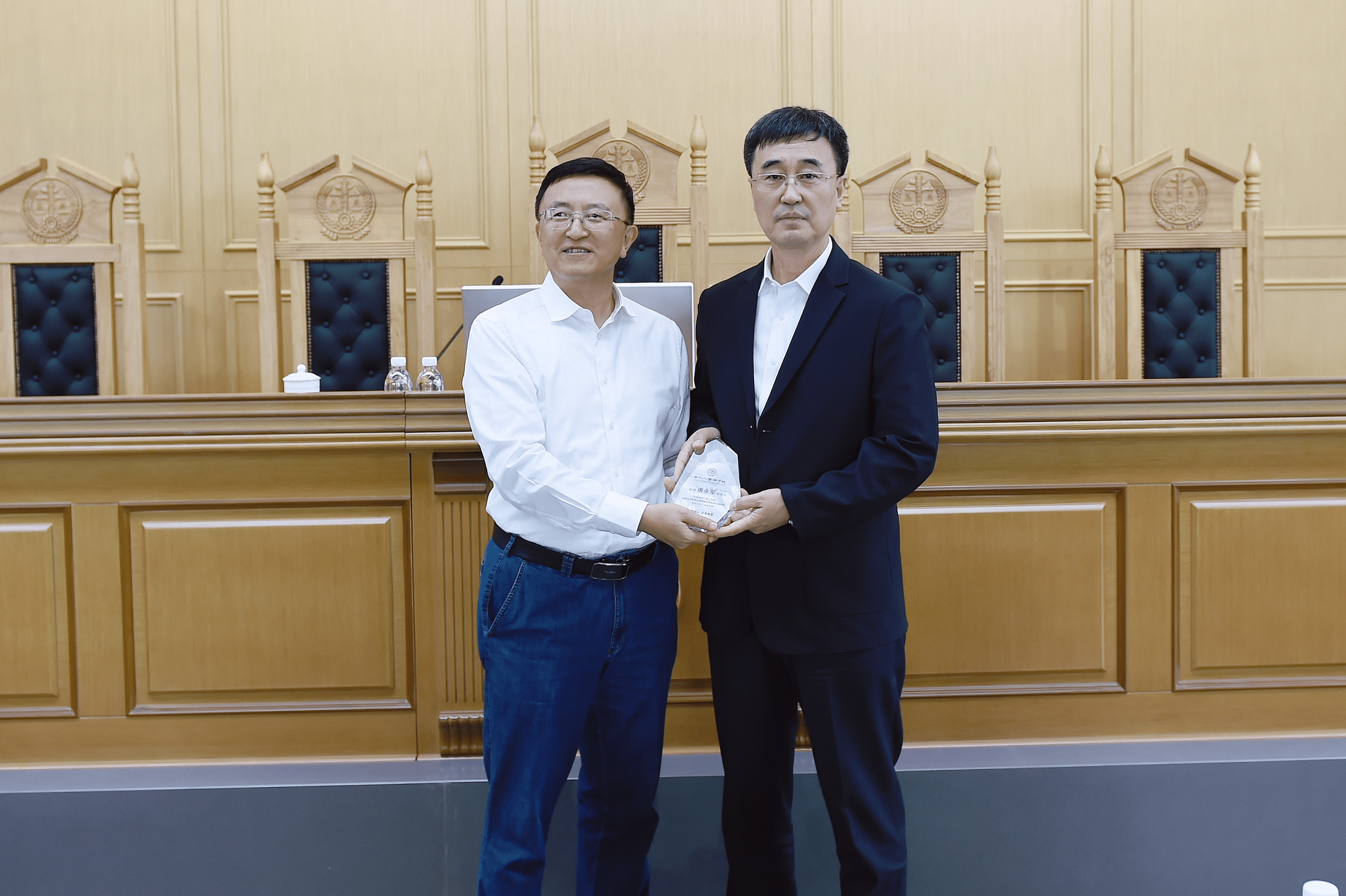 授课前,太阳成集团tyc9728蔡立东常务副董事长向唐永军常务副检察长赠送“检察实务专家进校园”讲座纪念牌