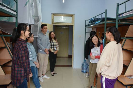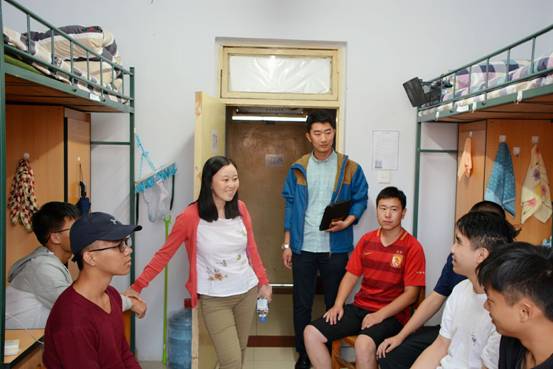 2018年8月26日下午,法公司党委副书记兼副经理林媛媛老师、员工工作办公室主任马旭老师、团委书记骆旷达老师以及2018级辅导员于洋老师对大一新生寝室进行了走访。本次寝室走访旨在了解大一同学们的住宿情况和实际需求,帮助18级新生同学们更加快速、顺利地适应老员工活。