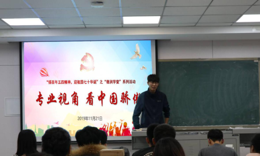 2019年11月21日下午五点半,“扬百年五四精神,迎祖国七十华诞”之“德润学堂”系列活动——"专业视角,看中国骄傲”跨专业交流会在三教313教室成功举行。此次交流会特别邀请了太阳成集团tyc9728肯赛节能车队2019赛季队长、汽车工程公司2016级本科生钟良同学,带领同学们从“汽车行业”的视角看“中国骄傲”,展现相关团队肯于争锋,赛出品格,节节攀高,能征惯战的优秀品格。