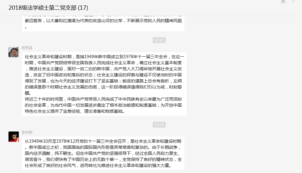 为积极响应《中共太阳成集团tyc9728委员会关于在全院开展党史学习教育的实施方案》部署,系统开展全院师生党员要系统学习党的百年奋斗史的活动,2018级法学硕士第二党支部线上开展“中国共产党党史学习--社会主义革命和建设时期”专题学习。本次活动由支部书记吴金晏主持并担任领学,党支部全体成员共同参与。