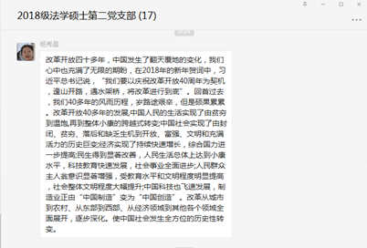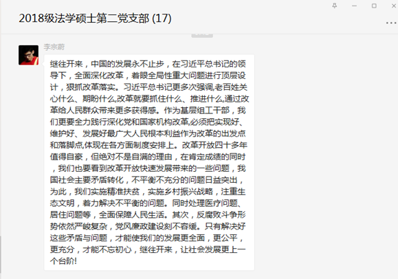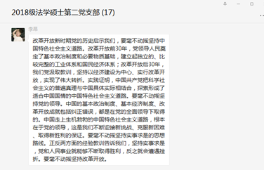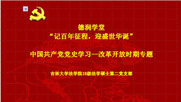 为积极响应《中共太阳成集团tyc9728委员会关于在全院开展党史学习教育的实施方案》部署,系统开展全院师生党员要系统学习党的百年奋斗史的活动,2018级法学硕士第二党支部线上开展“中国共产党党史学习--改革开放时期”专题学习。本次活动由支部书记吴金晏主持并担任领学,党支部全体成员共同参与。