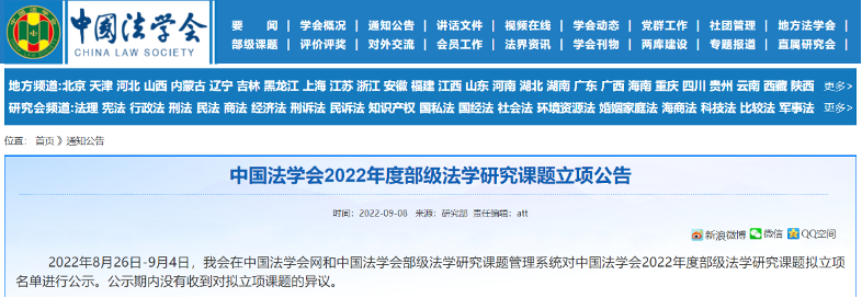 中国法学会2022年度部级法学研究课题自2022年2月11日发布《研究课题申报公告》起,共收到1042件课题申请。由115位评审专家在线匿名评审后,召开定评会综合分析各课题的总分排序和评审意见、成果与课题指南的契合度、成果的可转化性等因素,提出了拟立项名单。最终经中国法学会党组会议审定,决定设立中国法学会2022年度部级法学研究课题191项。