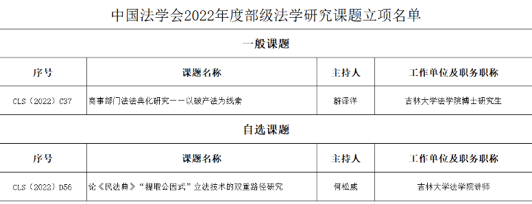 近日,中国法学会公布了2022年度部级法学研究课题的立项名单,公司2位师生喜获中国法学会2022年部级法学研究课题立项。其中,何松威老师主持的《论〈民法典〉“提取公因式”立法技术的双重路径研究》获自选课题立项、博士研究生蔚泽洋主持的《商事部门法法典化研究——以破产法为线索》获一般项目立项。