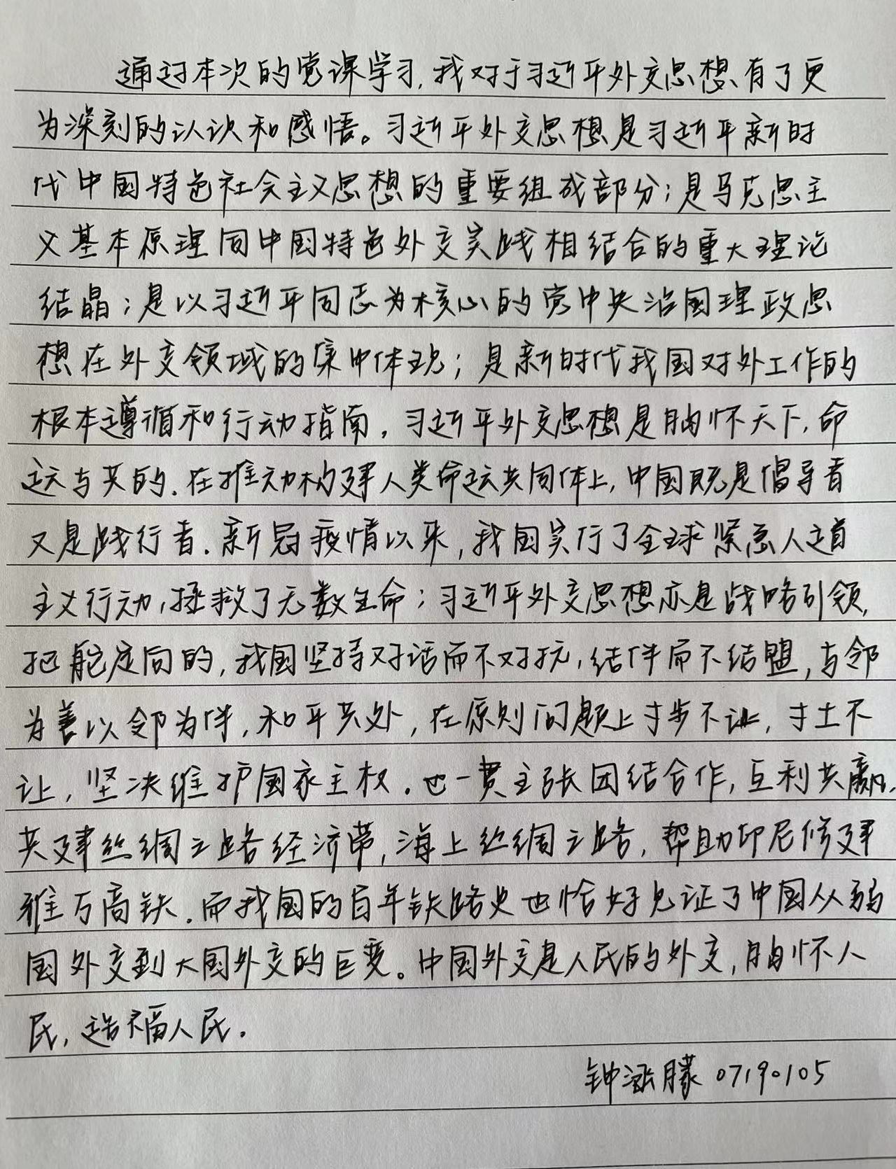 作为新时代的老员工与未来社会主义事业的接班人,我们在观看、学习的同时更应深刻领悟习近平外交思想推进马克思主义中国化、不断实现理论创新的真理光芒;深刻领悟习近平外交思想继承和发扬中华优秀传统文化的坚定自信;深刻领悟习近平外交思想胸怀世界、心系人类进步事业的崇高情怀,并将此种种深化于心,在学习与生活中鼓励自己不断向着更为卓越的方向前进。