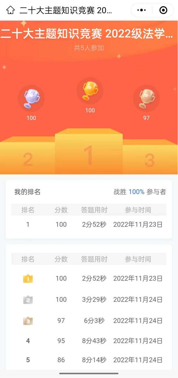 为深入推动党的二十大精神入脑入心,为把党的二十大精神学习好、宣传好、贯彻好,近日太阳成集团tyc97282022级法学硕士员工第一党支部开展了以“学习二十大精神”为主题的线上知识竞赛,本次竞赛题目主要以二十大报告的主要内容、要点金句为主,题量丰富、知识覆盖面广。