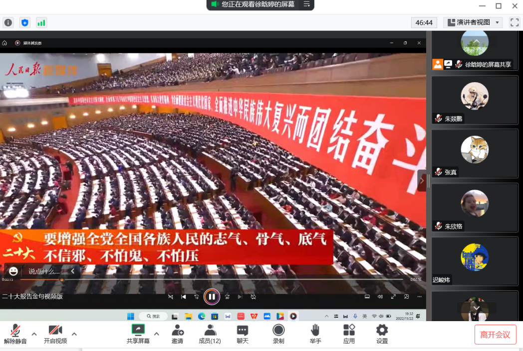 在认真学习了党的二十大报告之后,党支部成员集体观看了《二十大报告金句》和《治国有数——将自我革命进行到底》主题视频,对二十大报告的相关内容有了更为细致、深入的理解。