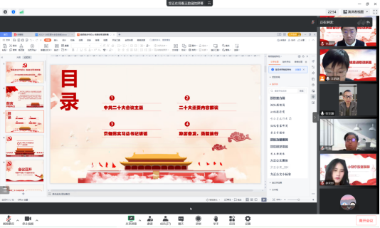 中国共产党第二十次全国代表大会,是在全党全国各族人民迈上全面建设社会主义现代化国家新征程、向第二个百年奋斗目标进军的关键时刻召开的一次十分重要的大会。党支部书记王韵涵同志从“中共二十大会议主题”“二十大重要内容解读”“贯彻落实习总书记讲话”“踔厉奋发,勇毅前行”四个方面领学了党的二十大会议内容。她指出,党的二十大报告不仅回顾与反思了过去五年与十年的工作,而且从教育、法治、文化、民生、环境等等全面而深入地规划了未来我党的工作与任务安排,展现出我党全心全意为人民服务的宗旨,为人民谋幸福的根本目的,带领人民创造美好生活的奋斗目标。在这个充满挑战又充满希望的时代,我们应当始终跟党走,团结在党的旗帜之下,坚定信念、坚定信仰、踔厉奋发、勇毅前行,“历百折而仍向东”。