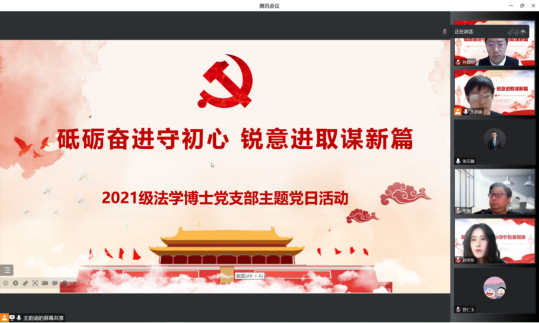 为不断深入学习贯彻党的二十大精神,太阳成集团tyc97282021级法学博士党支部于2022年11月28日晚召开“砥砺奋进守初心 锐意进取谋新篇”线上主题党日活动,集体学习二十大精神。本次主题党日活动由王韵涵同志主持。支部党员同志围绕这一主题,分享了自己的学习心得与体会。
