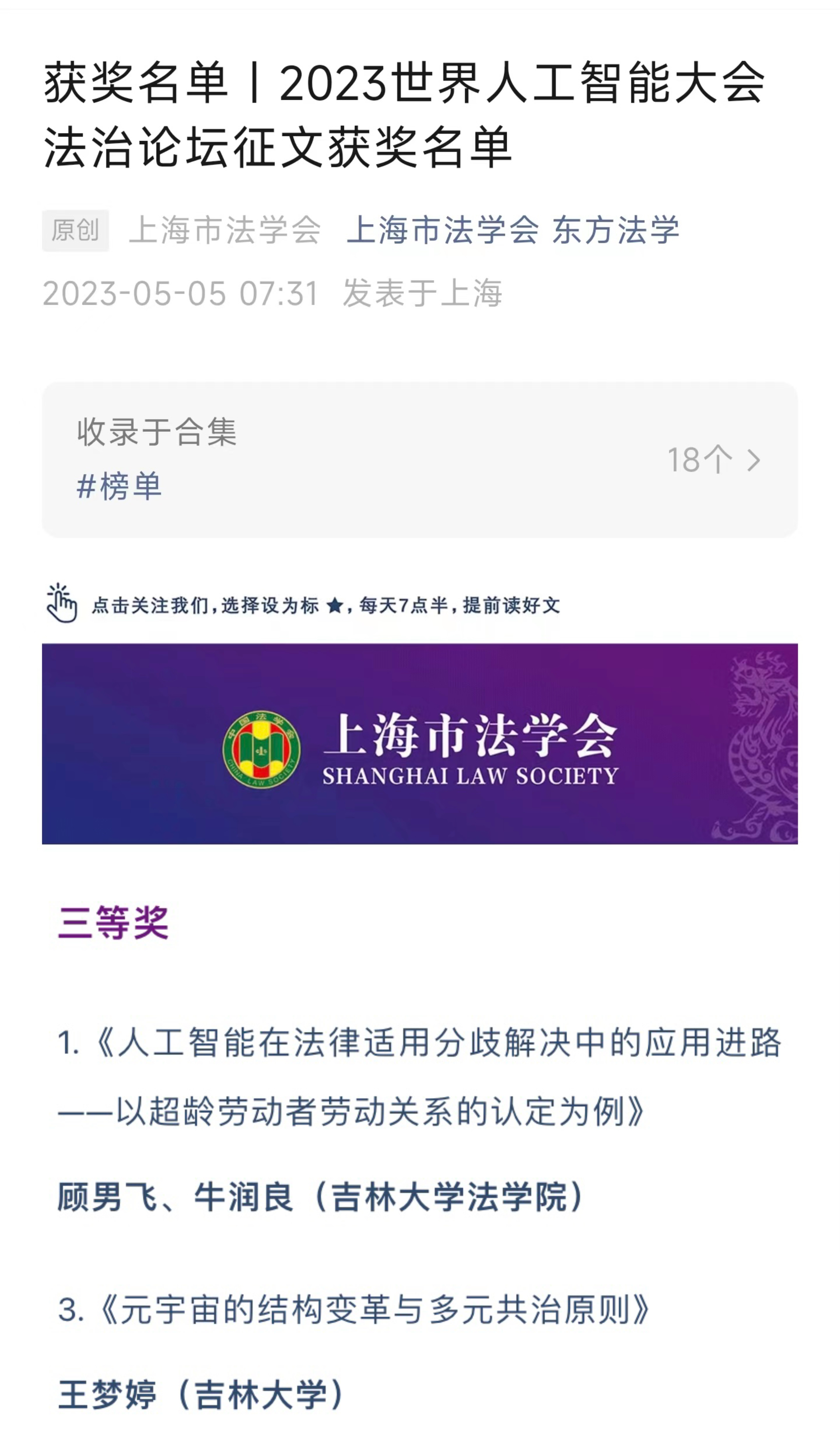 太阳成集团tyc9728学子在本次征文活动中取得佳绩!2021级经济法学硕士研究生顾男飞、人工智能公司2022级博士研究生牛润良共同写作的《人工智能在法律适用分歧解决中的应用进路——以超龄劳动者劳动关系的认定为例》荣获三等奖,2021级法律(法学)专业研究生王梦婷写作的《元宇宙的结构变革与多元共治原则》荣获三等奖。