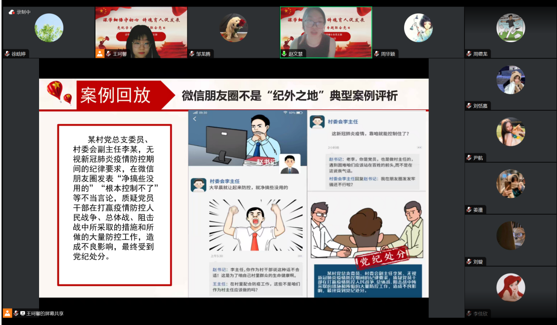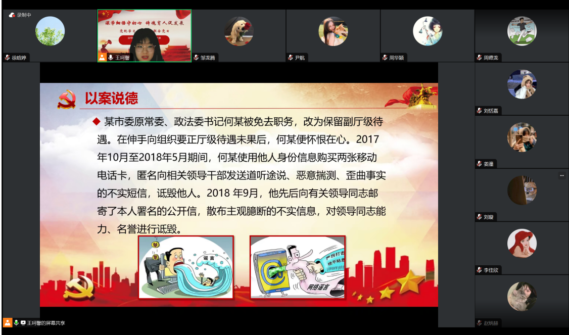 为进一步扎实推动党纪学习教育走深走实,着力巩固学习成果,营造浓厚学习氛围,坚定党员理想信念,增强党性修养,2022级法学硕士各党支部于5月26日举办“深学细悟守初心 铸魂育人促发展”联合线上党日活动,旨在引导全体党员和积极分子学出更加坚定的政治忠诚,学出更加自觉的纪律意识,学出更加过硬的能力作风,学出更加强烈的责任担当。本次活动由2022级法学硕士第三党支部书记王珂馨主持