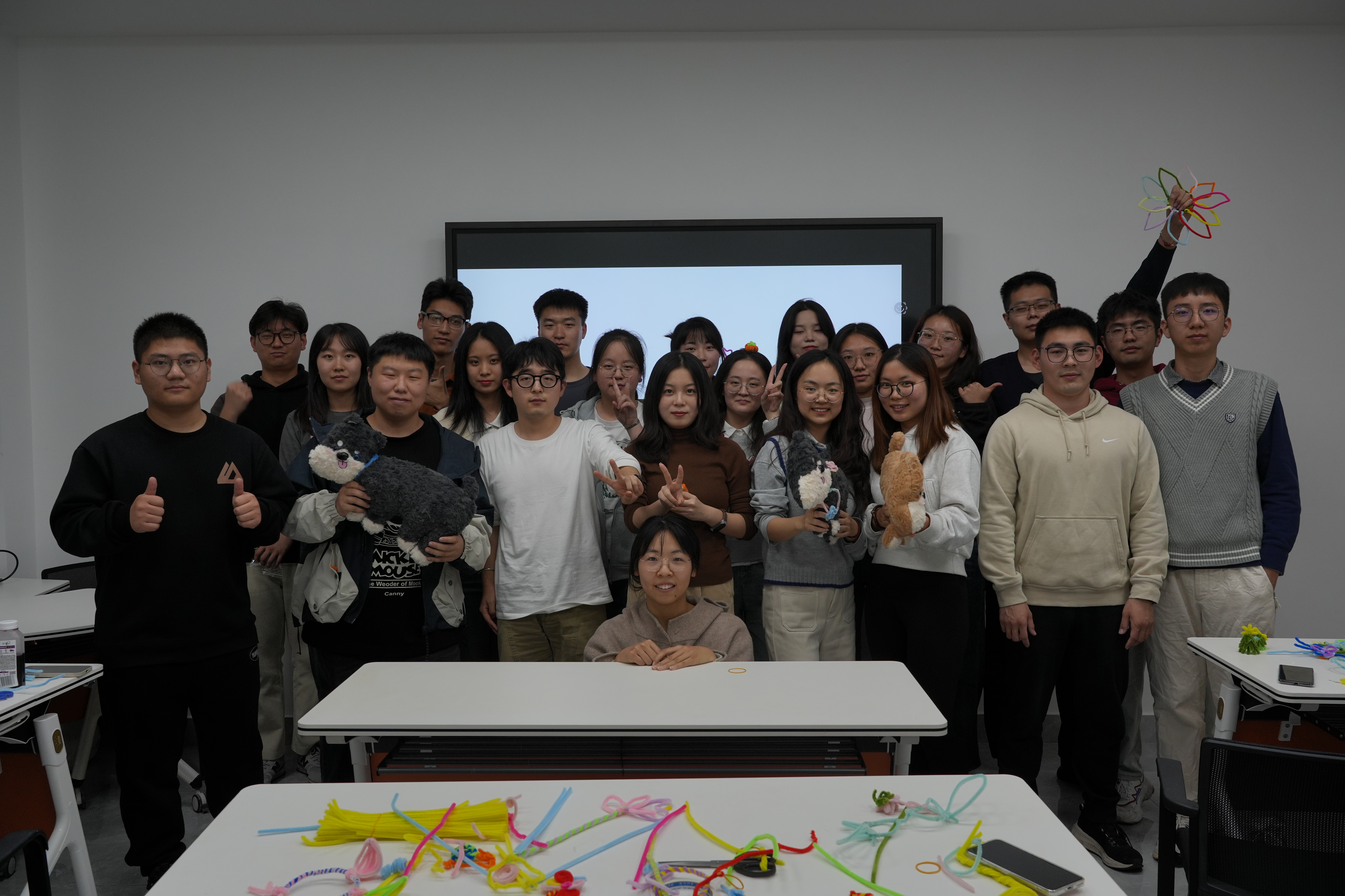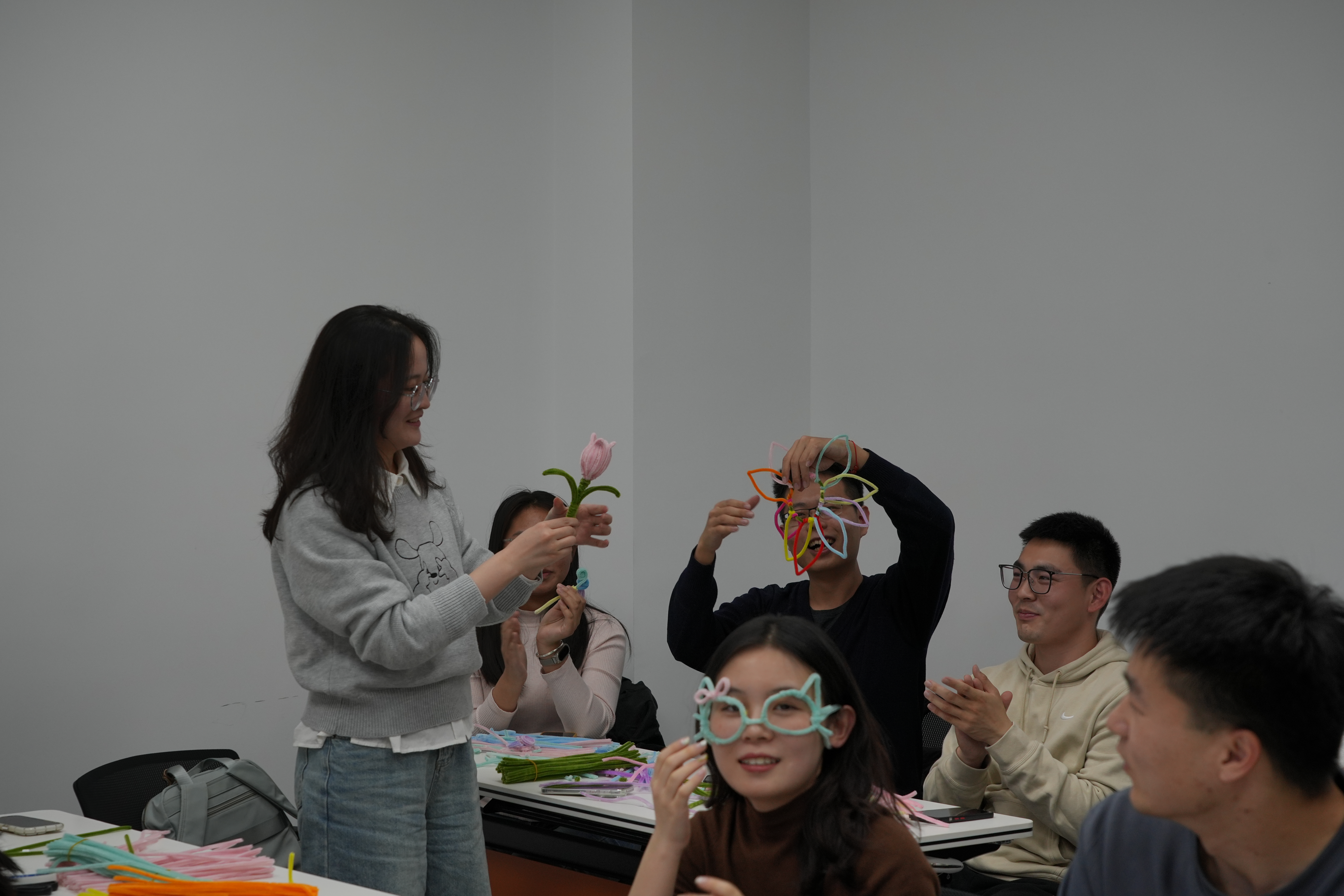 在趣味游戏结束后,进入了小组制作扭扭棒环节。主持人为每个小组分发了一些扭扭棒和制作工具,要求小组成员共同合作,发挥创意,制作出一件作品。同学们充分发挥自己的想象力和动手能力,有的小组制作了精美的花朵,有的小组制作了可爱的小动物,还有的小组制作了富有创意的装饰品。在制作过程中,小组成员们相互协作,交流想法,共同解决遇到的问题。这个环节不仅锻炼了同学们的创造力和动手能力,还进一步加深了小组内成员之间的了解和信任,培养了团队合作精神。