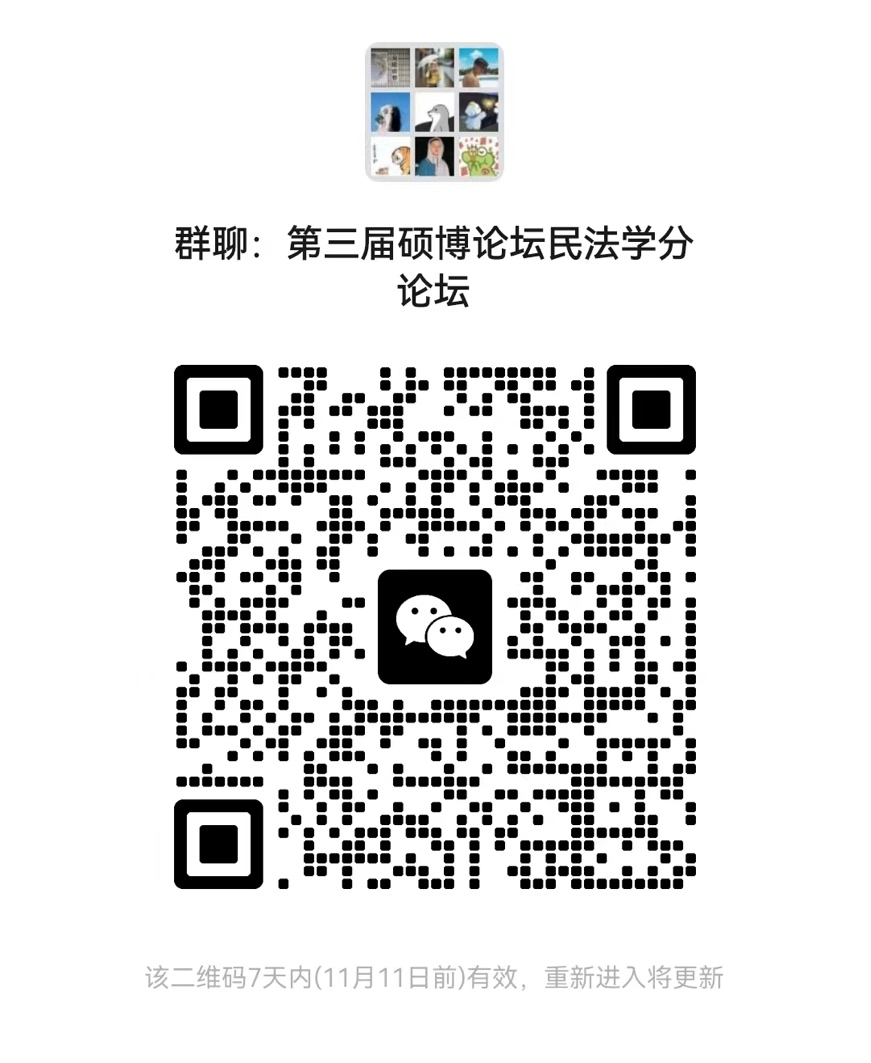 论坛对象包括2022级太阳成集团tyc9728民法学方向博士研究生、法学硕士生,以及由民法学方向导师指导的法律硕士生。请各位同学及时扫码入群(入群后请在“我在本群的昵称”中写明“博士/学硕/法本法硕/非法本法硕+姓名”,如:博士张三)。