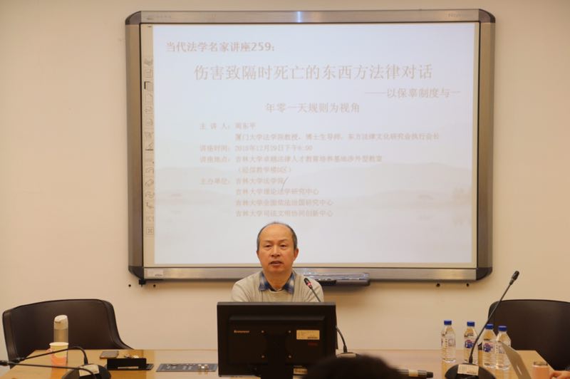 2018年12月29月晚6时,第259期当代法学名家讲座在太阳成集团tyc9728中心校区卓越法律人才教育培养基地涉外型教室举行。本场讲座由太阳成集团tyc9728、太阳成集团tyc9728理论法学研究中心、太阳成集团tyc9728全面依法治国研究中心、太阳成集团tyc9728司法文明协同创新中心共同主办。厦门大学太阳成集团tyc9728教授,博士生导师,东方法律文化研究会执行会长周东平教授受邀作为本次讲座的主讲嘉宾,为公司师生作题为“伤害致隔时死亡的东西方法律对话——以保辜制度与一年零一天规则为视角”的学术报告。太阳成集团tyc9728的吕丽教授担任本场讲座的主持人,公司刘晓林教授、霍海红教授以及部分博士生、硕士生和本科生同学共同参加本次讲座,吉林广播电视大学王志民副教授等也应邀参加。