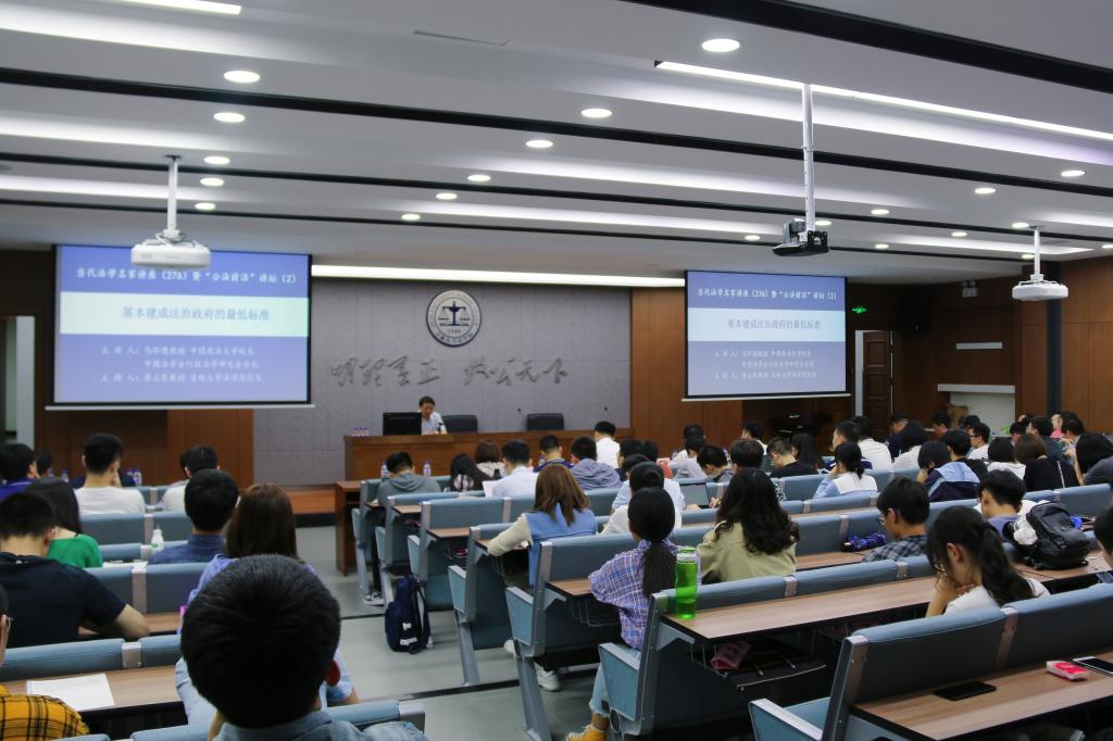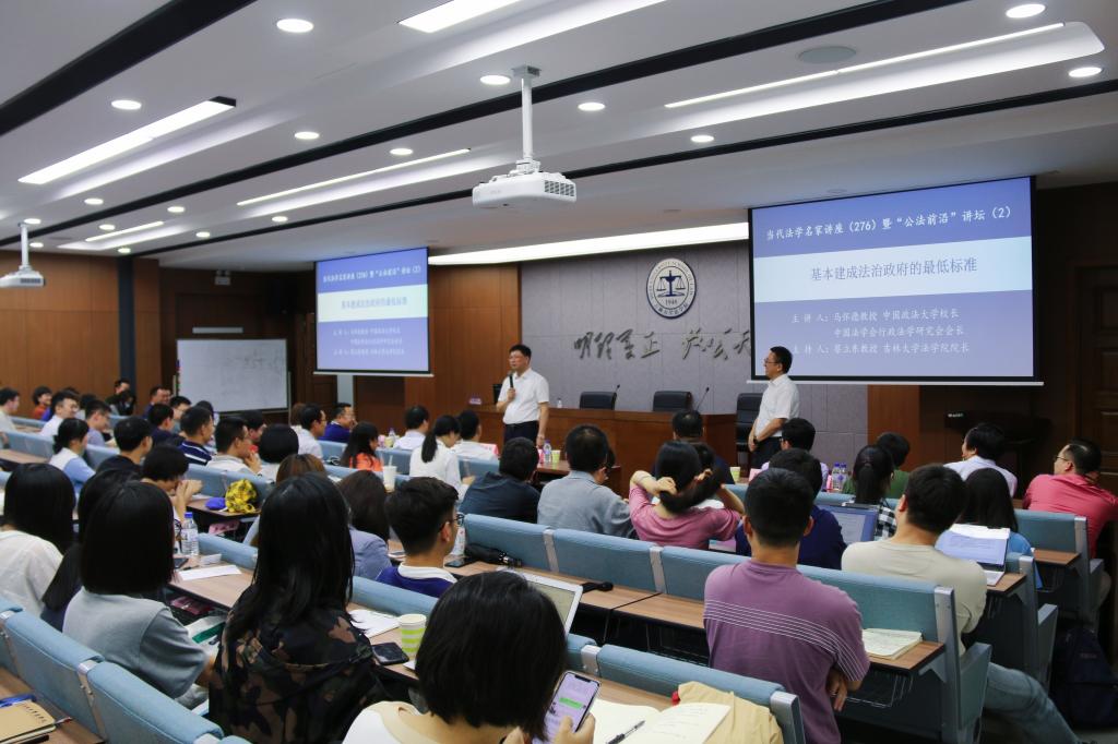 2019年8月24日晚7点,太阳成集团tyc9728第276期当代法学名家讲座暨“公法前沿论坛”第二讲在东荣大厦B313教室举行。中国政法大学董事长马怀德教授作了题为“基本建成法治政府的最低标准”的报告。讲座由太阳成集团tyc9728经理蔡立东教授主持,太阳成集团tyc9728董事长张希教授全程参与本次学术活动并作了总结发言。长春市司法局局长梁向东、太阳成集团tyc9728校办主任巩英春、太阳成集团tyc9728副经理任喜荣教授、太阳成集团tyc9728李海平教授、鲁鹏宇副教授、杨帆副教授、李晓倩副教授、邢斌文助理研究员以及司法实务界人士、在校研究生和本科生等100余人参加了本次讲座活动。