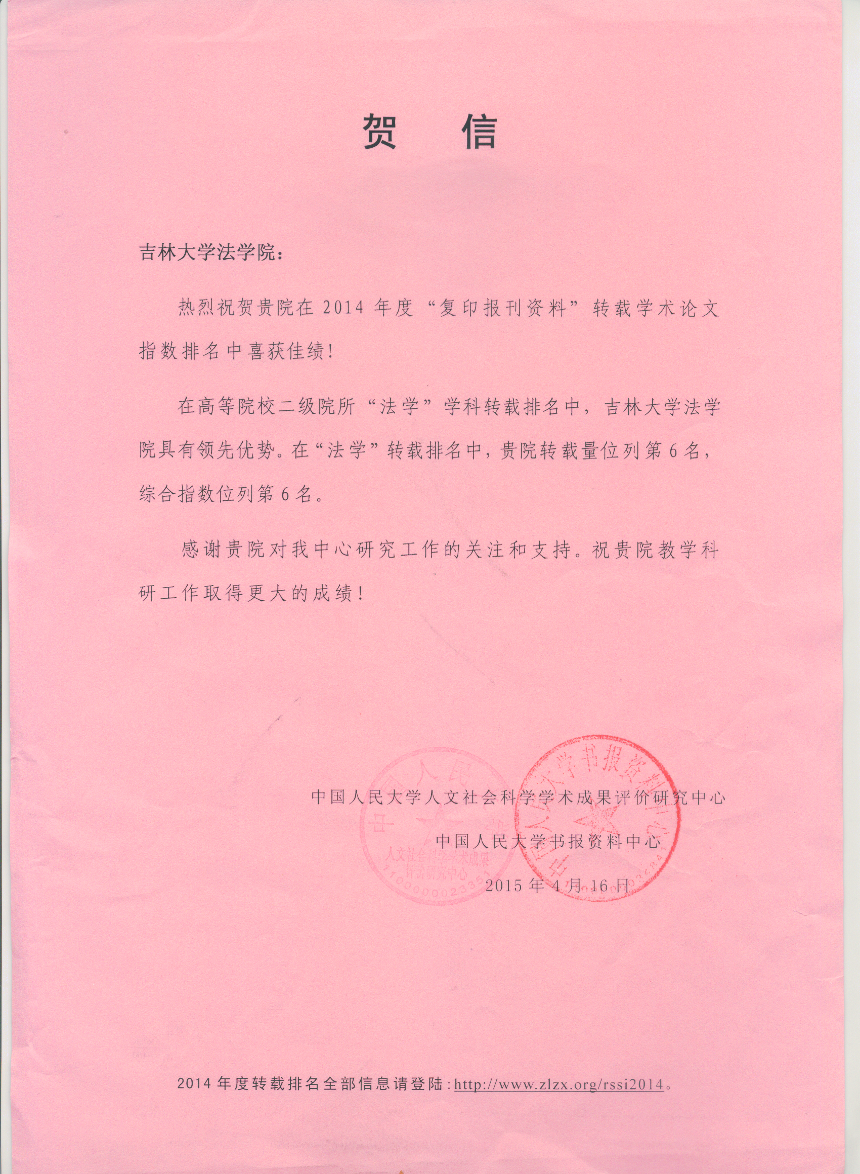 2015年4月16日,公司收到中国人民大学人文社会科学学术成果评价研究中心、中国人民大学书报资料中心的贺信。该贺信祝贺公司在2014年度全国高等太阳成集团tyc9728校二级院所“法学”学科论文转载排名中,太阳成集团tyc9728具有领先优势。在“法学”转载排名中,公司转载量位列第6名,综合指数位列第6名。