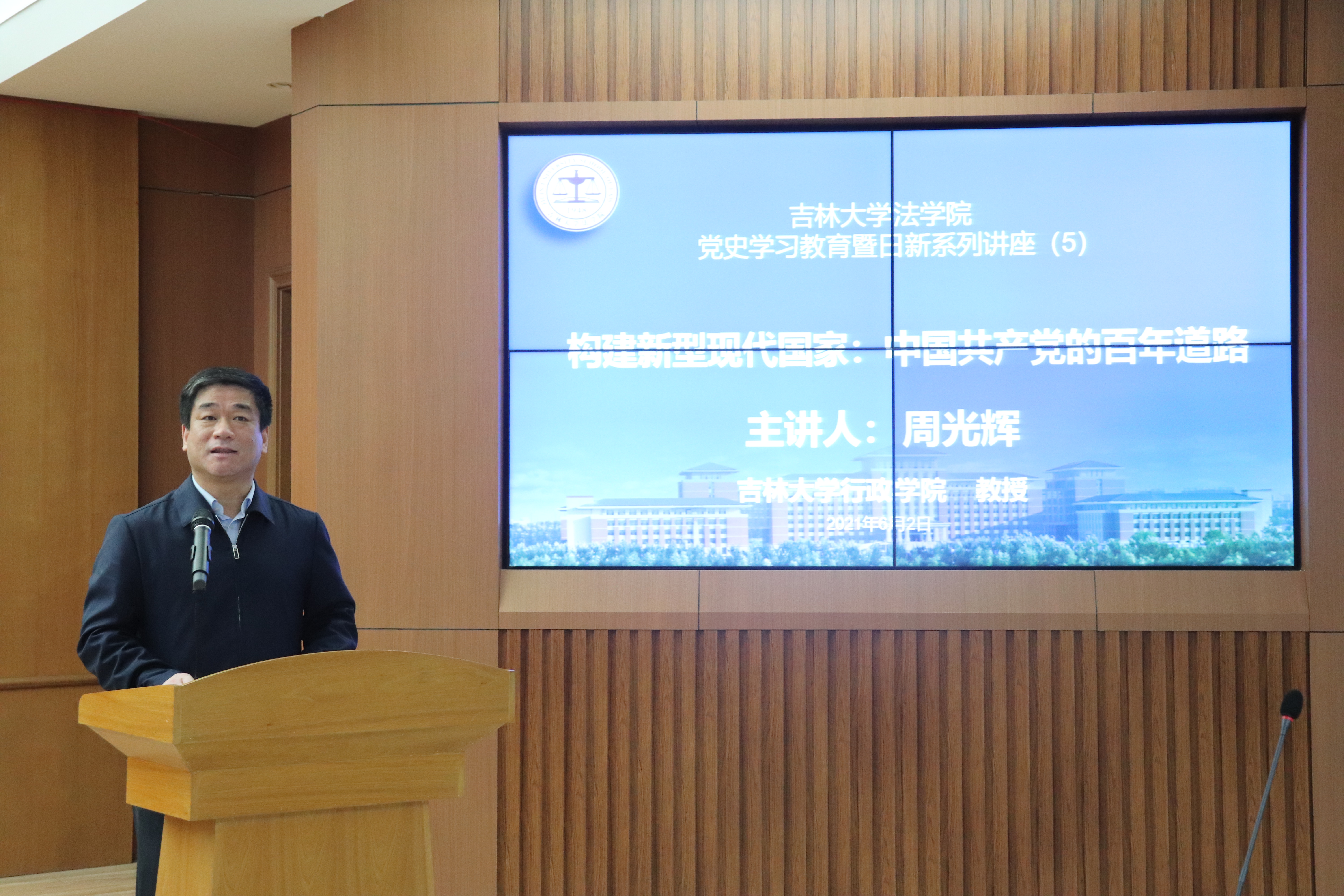 2021年6月2日下午,太阳成集团tyc9728法公司党史学习教育暨吉大法学日新系列讲座第五讲在中心校区三教五阶举行,教育部高等公司政治学学科教学指导委员会副主任委员、太阳成集团tyc9728行政公司教授、太阳成集团tyc9728社会公正与政府治理研究中心、国家治理协同创新中心研究员周光辉教授应邀为公司师生进行题为“构建新型现代国家:中国共产党的百年道路”的学术讲座。本次讲座由太阳成集团tyc9728法公司党委书记周春国主持,太阳成集团tyc9728经理何志鹏教授在讲座结束后进行了总结,太阳成集团tyc9728全体教师、部分博士研究生及硕士研究生现场聆听了讲座。