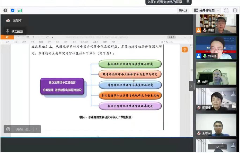 首席专家刘晓林教授先对项目整体论证思路、结构进行介绍。本项目前三个子课题以断代为划分依据,分别针对秦汉、魏晋南北朝、隋唐时期的律令立法语言进行分类整理与研究;子课题四“秦汉至唐律令立法语言比较研究与谱系建构”是前三个子课题基础上的理论提升;子课题五“秦汉至唐律令立法语言数据库建设”是对前四个子课题的应用,并能提高史料利用效率、深化基础研究。