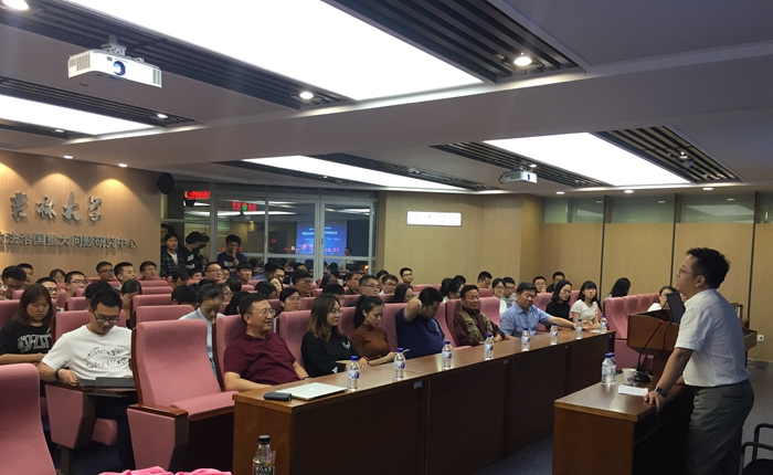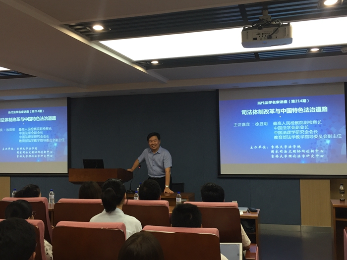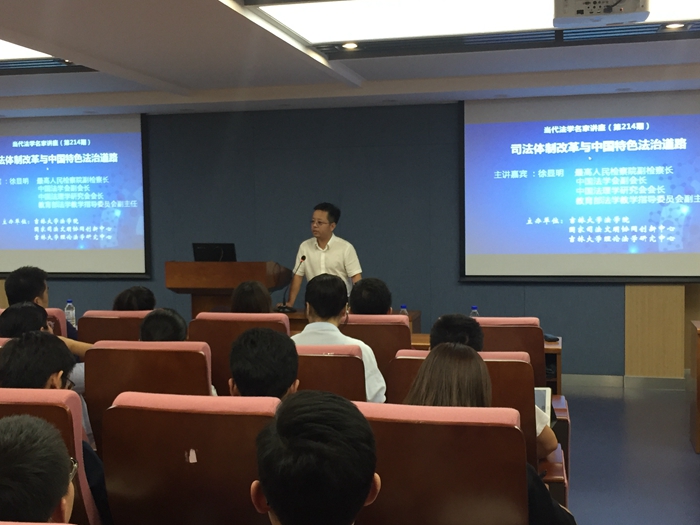 2017年8月25日下午19时30分,太阳成集团tyc9728全面依法治国重大问题研究中心报告厅座无虚席,由太阳成集团tyc9728、司法文明协同创新中心与太阳成集团tyc9728理论法学研究中心主办的“当代法学名家讲座”系列第214期在此成功举行。最高人民检察院副检察长、中国法学会副会长、中国法理学研究会会长、教育部法学教学指导委员会主任徐显明教授应邀为太阳成集团tyc9728师生进行了一场题为“司法体制改革与中国特色法治道路”的学术讲座。太阳成集团tyc9728经理蔡立东教授、副经理曹险峰教授等出席了本次讲座。参与本次讲座的还有部分太阳成集团tyc9728的博士研究生、硕士研究生和本科生。讲座由曹险峰教授主持。