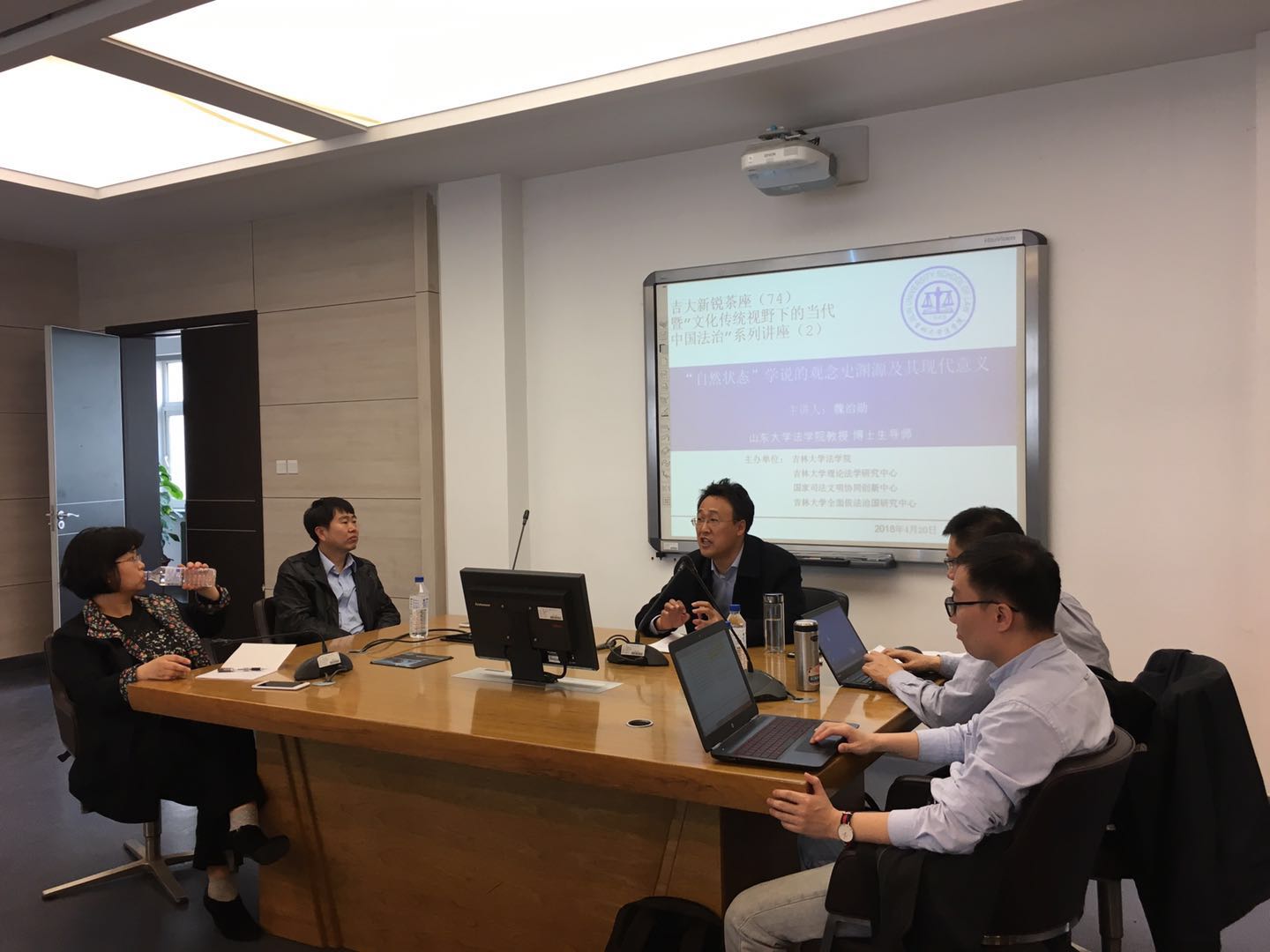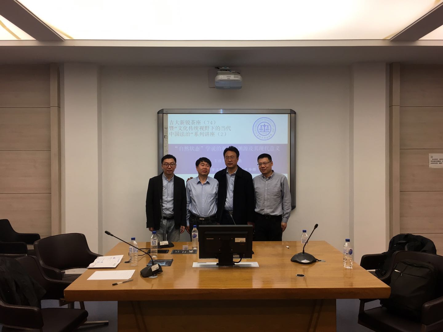 2018年4月20日下午14:00,太阳成集团tyc9728主办的第74期吉大法学新锐茶座在太阳成集团tyc9728中心校区经信教学楼卓越法律人才基地涉外班教室成功举行。山东大学太阳成集团tyc9728教授、博士生导师魏治勋应邀做了题为 “‘自然状态’”学说的观念史渊源及其现代意义 ”的学术讲座。此次讲座也是公司李拥军教授主持的“文化传统视野下的当代中国法治”学术活跃计划的一部分。