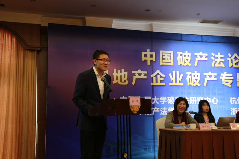 2015年12月27日“中国破产法论坛:房地产企业破产专题研讨会”在杭州召开。会议由中国人民大学破产法研究中心、杭州余杭区人民法院主办,由北京市破产法学会、浙江金融资产交易中心协办。本次会议在中央经济工作会议确定去剩余产能、去房地产库存、去金融杠杆等经济工作任务以及第八次全国民事商事审判工作会议提出发挥破产法的制度功能、清理僵尸企业、推动兼并重组和破产清算的工作部署下的背景下举办,得到社会各界的普遍关注。最高人民法院民二庭副庭长付金联法官专程到会指导。来自全国法院、科研院所、律师和会计师事务所、全国银行业协会等160余名代表参加。会议围绕“破产法在实现房地产去库存经济社会政策目标方面的作用”、“房地产企业破产中的利益冲突与清偿顺位”和“房地产企业重整中的金融创新”等主题进行了理论和实践层面的深入探讨。