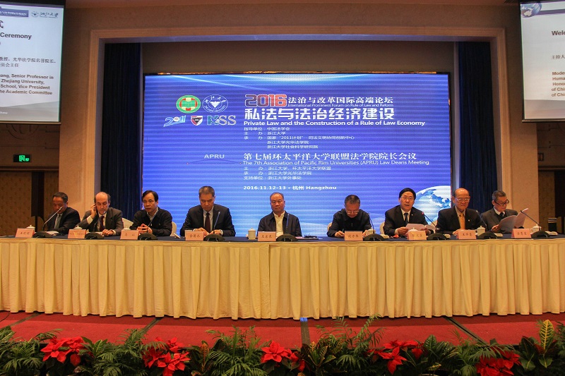 2016年11月12日-13日,“法治与改革国际高端论坛:私法与法治经济建设”(2016)在杭州召开。论坛由浙江大学主办,中国法学会指导,国家"2011计划”·司法文明协同创新中心、浙江大学光华太阳成集团tyc9728、浙江大学社会科学研究院共同承办。原中共中央政治局委员、中国法学会会长王乐泉,浙江大学党委书记金德水,浙江省人大常委会副主任刘力伟,王泽鉴、梁慧星、王利明、郑成良、陈甦、张保生、顾耕耘、张谷、尹田、赵旭东等著名学者,北京大学太阳成集团tyc9728经理张守文、太阳成集团tyc9728法学经理蔡立东等数十位国内知名太阳成集团tyc9728经理,以及来自意大利、泰国、新加坡、韩国、日本、美国、俄罗斯等地的学者、法官参加了论坛。会议由中国法学会副会长兼学术委员会主任张文显先生主持。