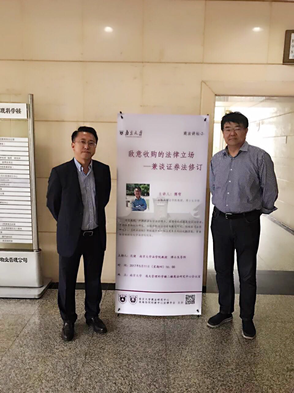 应南京大学南京大学商法研究中心邀请,2017年5月11日,公司傅穹教授在南京大学商法研究中心会议室作了《敌意收购的法律立场——兼谈证券法修订》的主题报告。