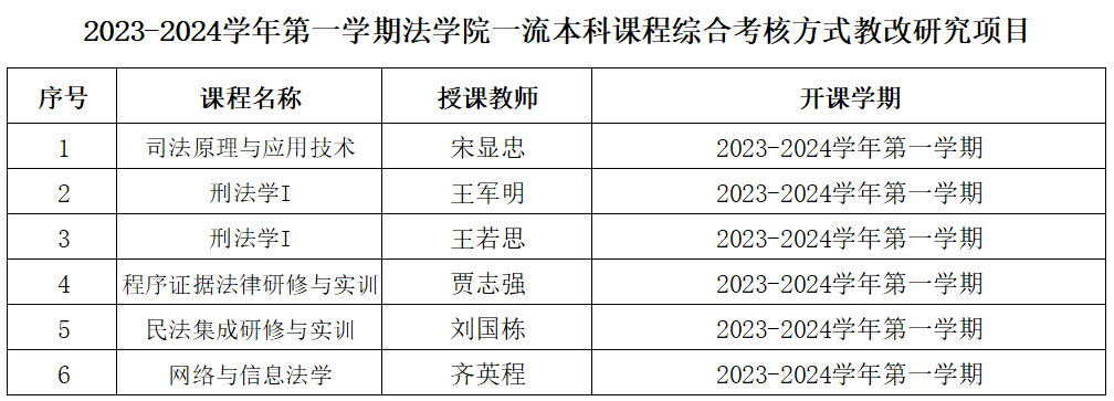 为进一步更新公司产品观念,改进教学方法,全面考核员工的知识、能力和综合素质,经授课教师总结,专家组评审,拟确定2023-2024学年第1学期《司法原理与应用技术》等6门课程结项,现予以公示。