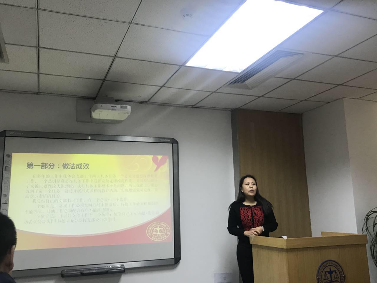 随后,各党支部书记围绕支部开展工作的“做法成效”、“存在问题及原因”和“下一步工作打算”三部分展开述职。商法学党支部的王艳梅老师作为第一个述职汇报人,对商法学党支部2017年开展工作的情况作了详细的回报,活动内容丰富,充分体现基层党支部的战斗堡垒作用。接下来,国际法学党支部书记姚莹、法律史党支部书记邓勇、环境法党支部赵惊涛、行政党支部书记刘舰及各员工党支部书记等依次进行了述职汇报。